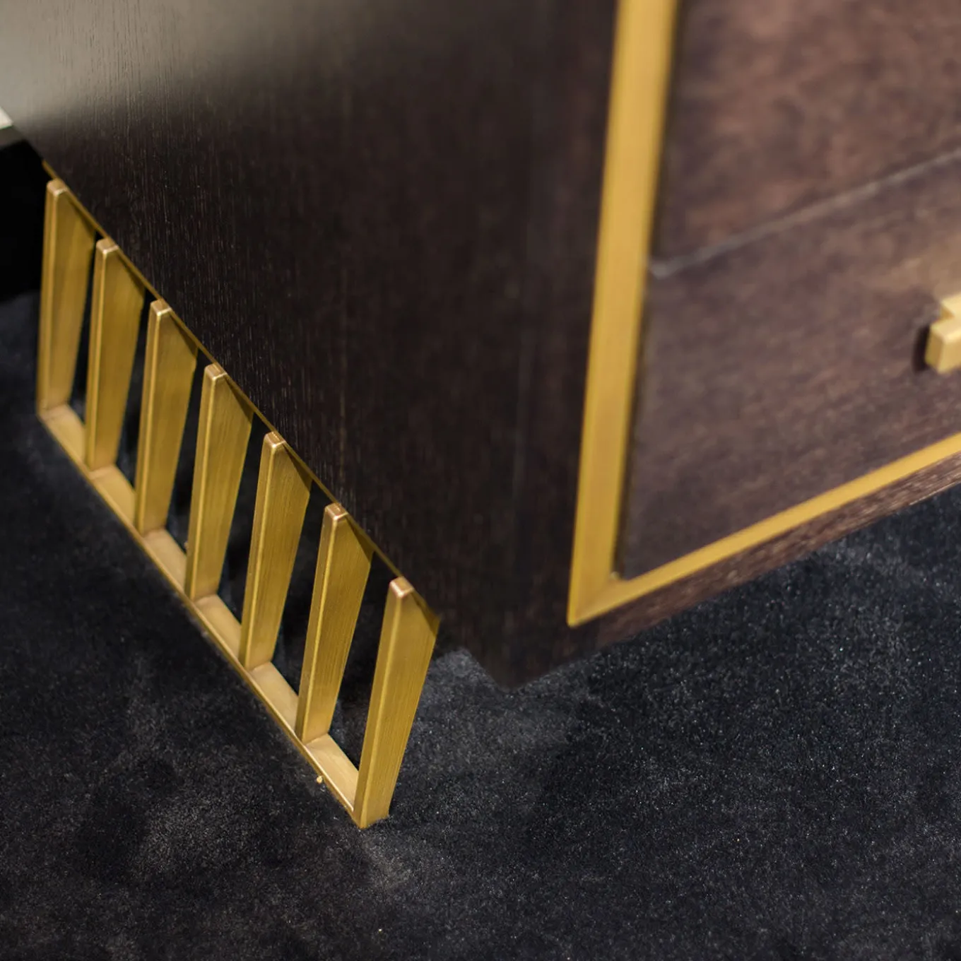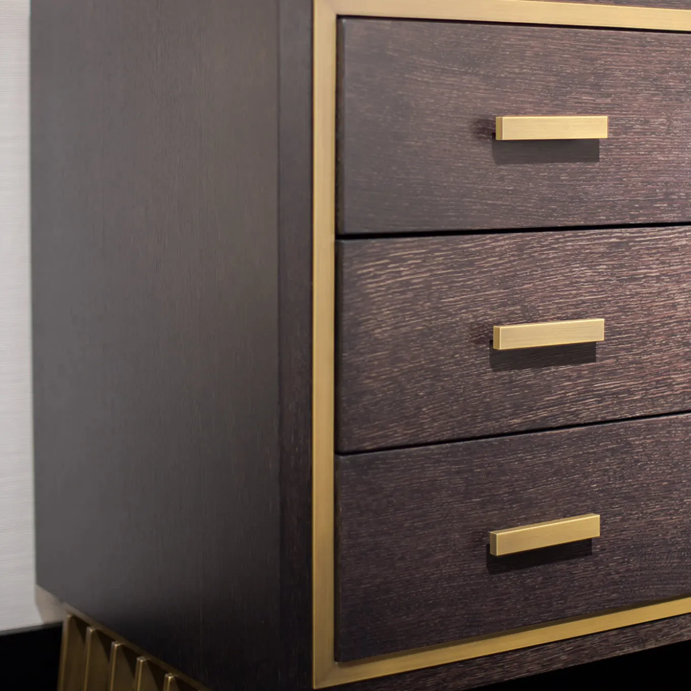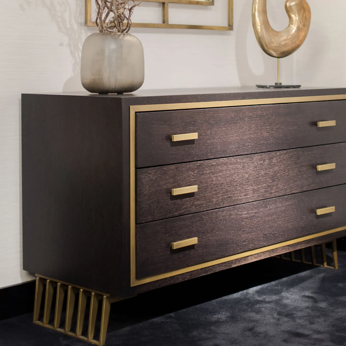 Standing on two openwork metal legs with a brass finish, this wooden dresser exudes restrained elegance and is be a perfect addition to a wide variety of refined interiors. Composed of three drawers with brass-finished metal handles, the structure is crafted of wood and showcases the warm-colored grain embellished by a thin metal band framing the dresser’s front side. Other finishing options both for metal and wood are available, please ask the Concierge for details.