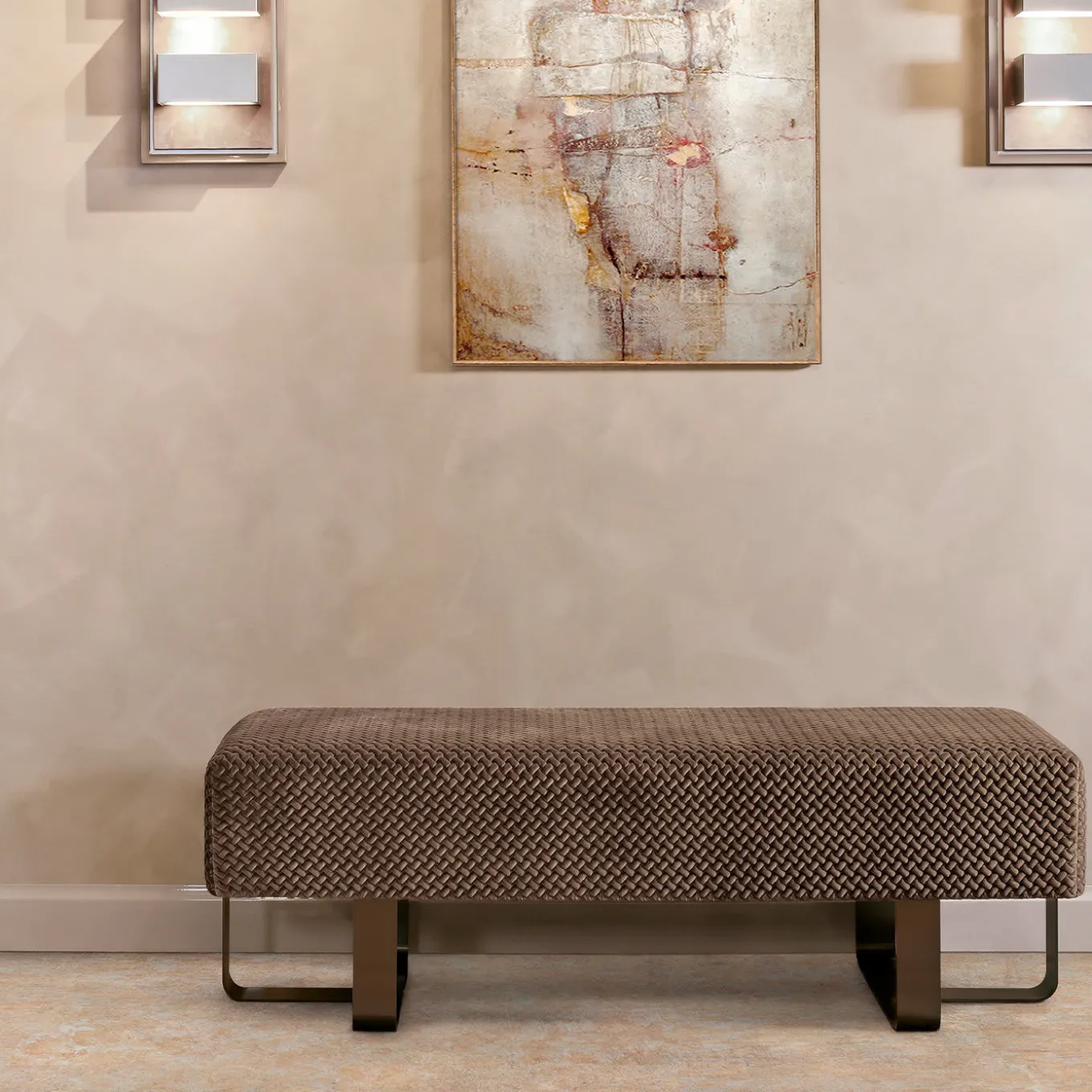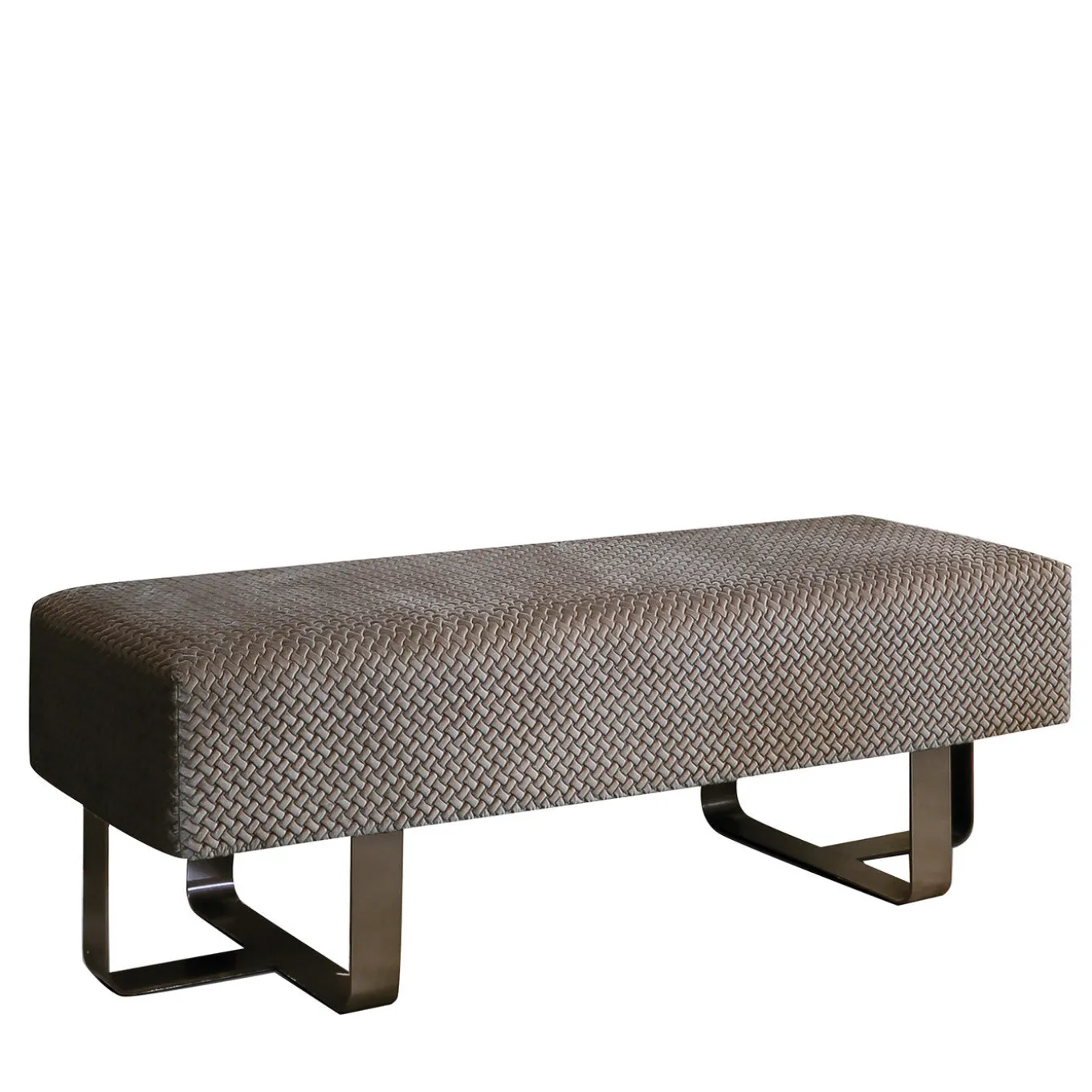 Distinctly modern, this versatile bench will make an elegant statement in contemporary entryways or bedrooms. Its airy and dynamic metal legs with a satin biotite finish consist of crossing elements with smoothed angles. The parallelepiped-shaped, plush cushion is upholstered in brown velvet with a braided texture. Additional leather upholsteries and metal finishes are available upon request to the Concierge.