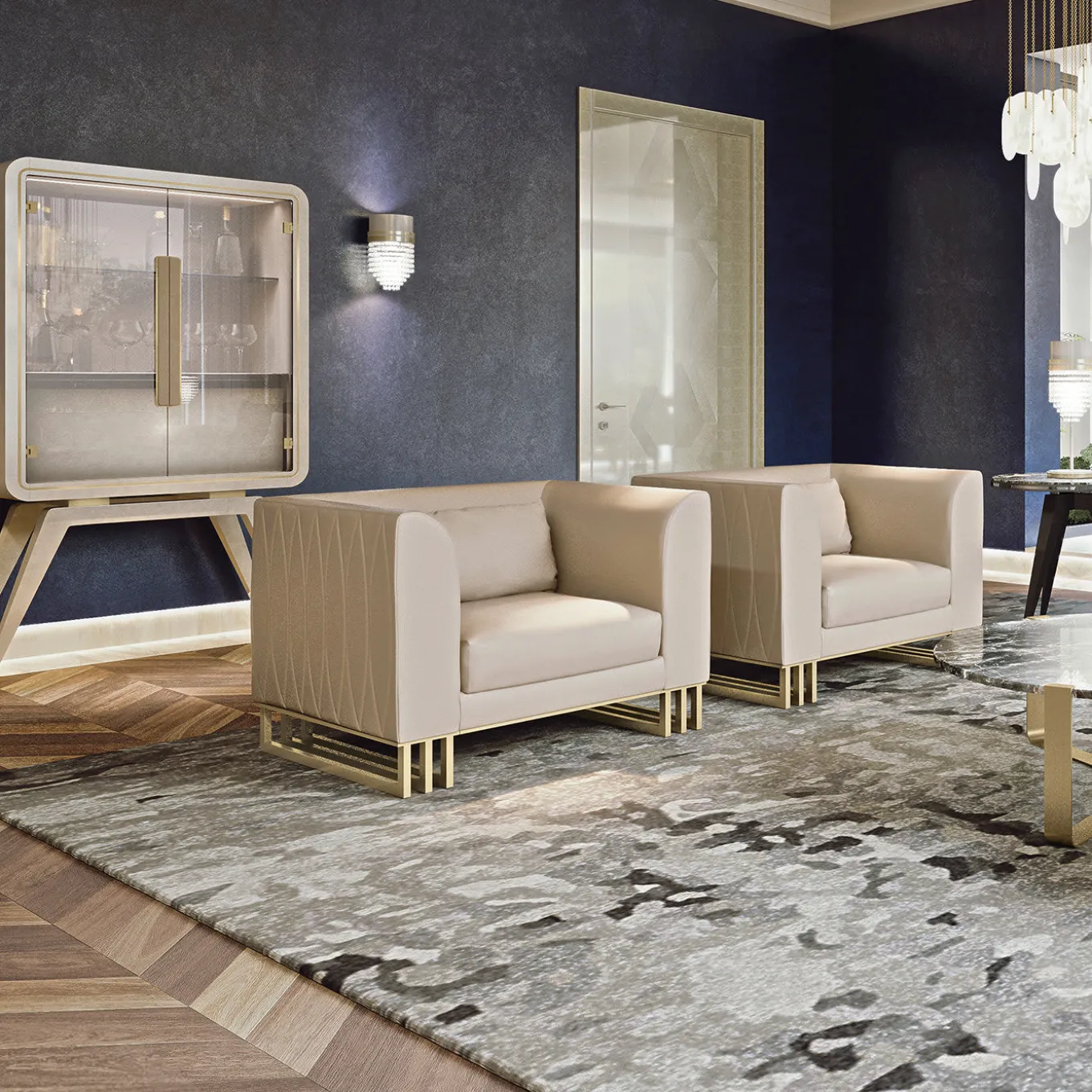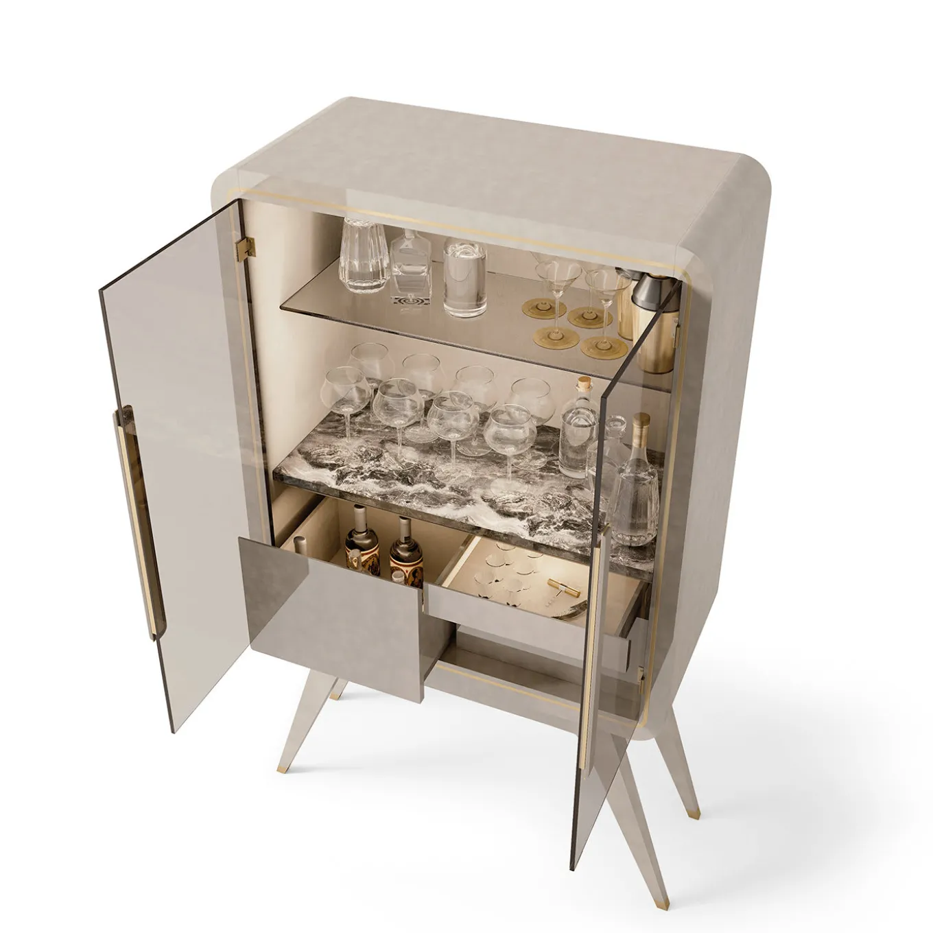 Show off your stemware collection in cool contemporary style with the Hanami Natural Mood Bar Unit. On solid wooden legs, the bar unit can be personalized with a variety of lacquers, shown here in high gloss Pearl Champagne. With two glass doors, the cabinet has three soft closing internal drawers and a shelf in Orobico gray marble. LED strip with sensor is included.