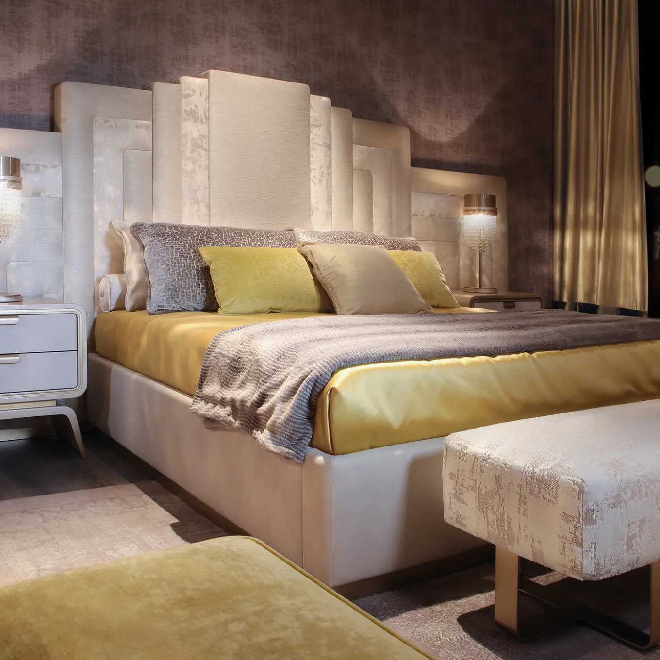 Dynamic and versatile, this sophisticated nightstand features a storage unit marked by a harmonious profile, smoothed along the corners. It provides two soft-close drawers covered in beige nubuck leather on the outside with exposed stitching. Resting on a sleek base with slanted sides, the structure appears as raised like a sculpture, emphasizing the high gloss pearl champagne lacquer only interrupted by gold satin-finished metal details. Customizations available, please consult the Concierge for details.