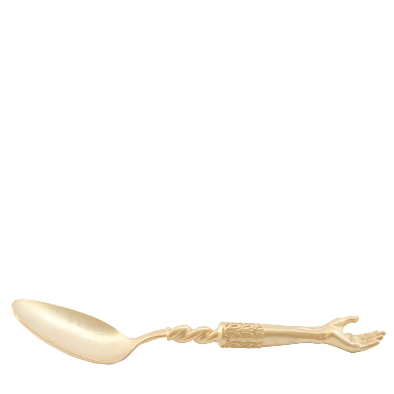 Part of the Joyas en Casa Collection – “gems at home” in English – this luminous spoon is handcrafted of brass with a precious gold plating. Its distinguishing feature is the anthropomorphic handle, featuring a twisted stem that morphs into an arm rendered in exquisite details. Endlessly playful and elegant, this spoon will lend a sophisticated accent to any silverware collection.