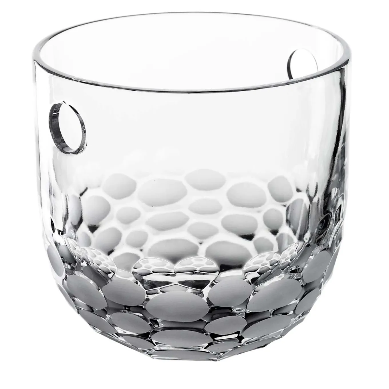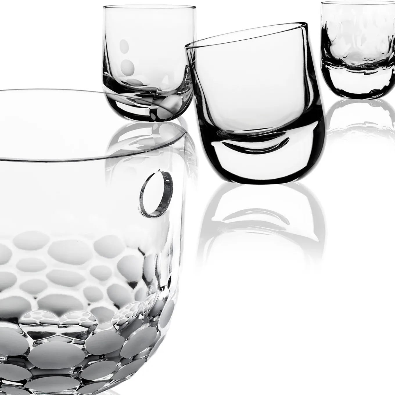 The Harry’s collection is inspired by the pure joy of whisky tasting. Part of the pleasure in such moments is given by the satisfaction and the awareness of holding something precious. The tumbler’s inner roundness reveals the mouth blown technique and allows the ice cube to be set always in the centre. On the outer surface, the engraved spots make the grip more stable and make the contemplation more interesting. This ice bucket features hand-blown and hand-cut pure lead crystal with over 24% PbO.