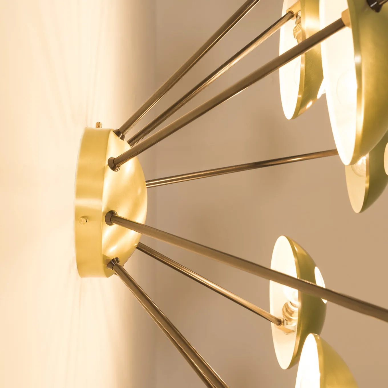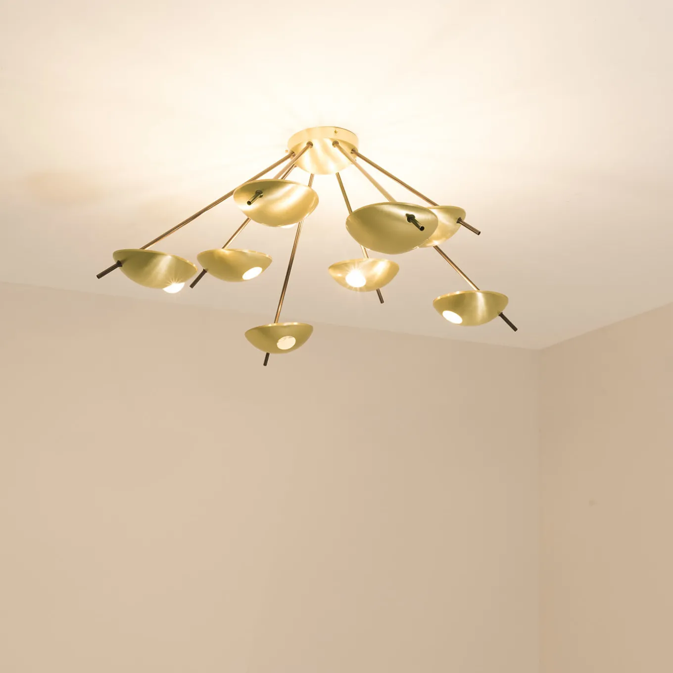 A superlative showcase of craftsmanship, this brass lamp can be used on the wall as well as on the ceiling thanks to its versatile silhouette inspired by ancient sundials. Composed of eight burnished half-spherical shades, it is available in other brass finishes upon request. It can be wired for North America (110V 60 Hz – E26 socket bulbs) or Europe (220V 50Hz – E27 socket bulbs), and is also compatible with incandescent and LED bulbs. Lightbulbs are not included.