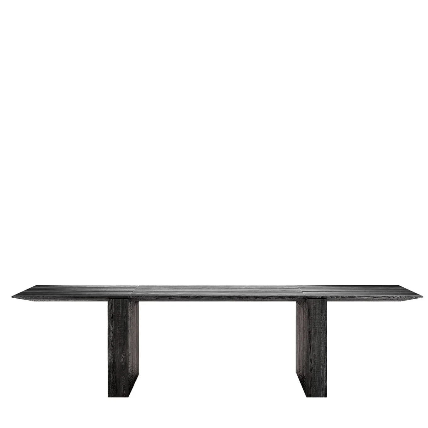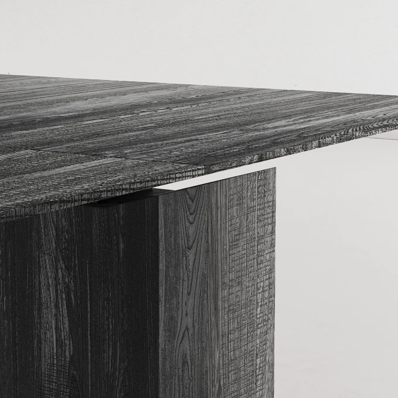 The Heroes dining table features a metal frame covered with antiqued, sandblasted, and black-stained fir wood. The top consists of nine solid wood panels assembled on an aluminum honeycomb slab, supported by two full-width flared bases. It embodies the strongest expression of formal brutalism, with its bold and raw design. A one-off edition with a custom engraved brass plaque, it’s a striking statement in any interior. Custom sizes and finishes available on request.