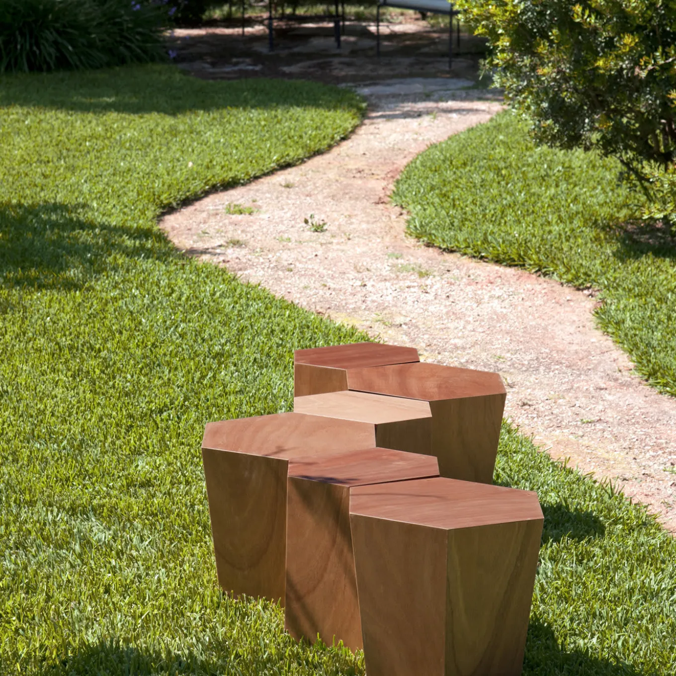 A geometric block of Okoume, a wood native of tropical West Africa and therefore resistant to humidity and light rain, this coffee table is a versatile piece that can also be used as a stool, bench or side table, both for indoors or outdoors. This sculptural piece may be matched to other Hexagons by Steven Holl and is also available in a Lecce limestone version, please ask the Concierge for details.