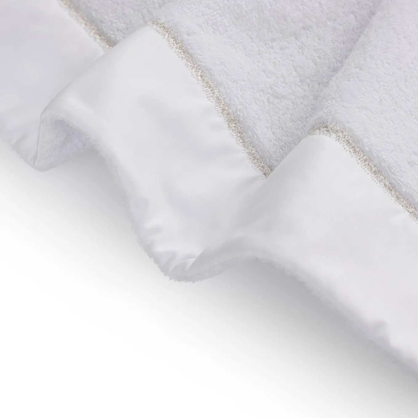 A precious and elegant set of guest towel (40x60cm), hand towel (60x100cm), and bath towel (110x100cm) to complement both classic and modern decors, each piece is deftly handcrafted of first-rate white terry cotton, embellished with a refined satin silver-embroidered band enhancing their clean yet plush aesthetic.