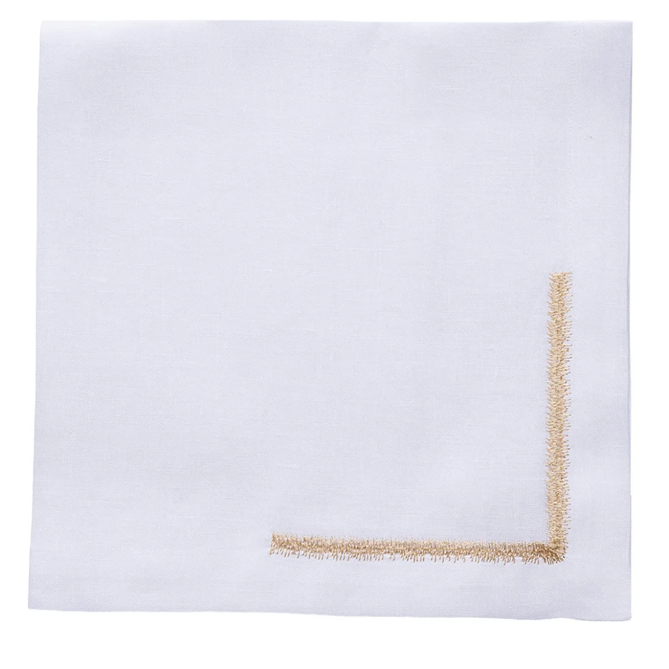 A stunning design of elegant simplicity, this set of four napkins will make for a precious addition to both traditional and modern-style dining tables. Masterfully handmade of first-rate white linen, each piece is enriched with marvelous golden handmade embroidery, adding a luminous and lavish character to the design.