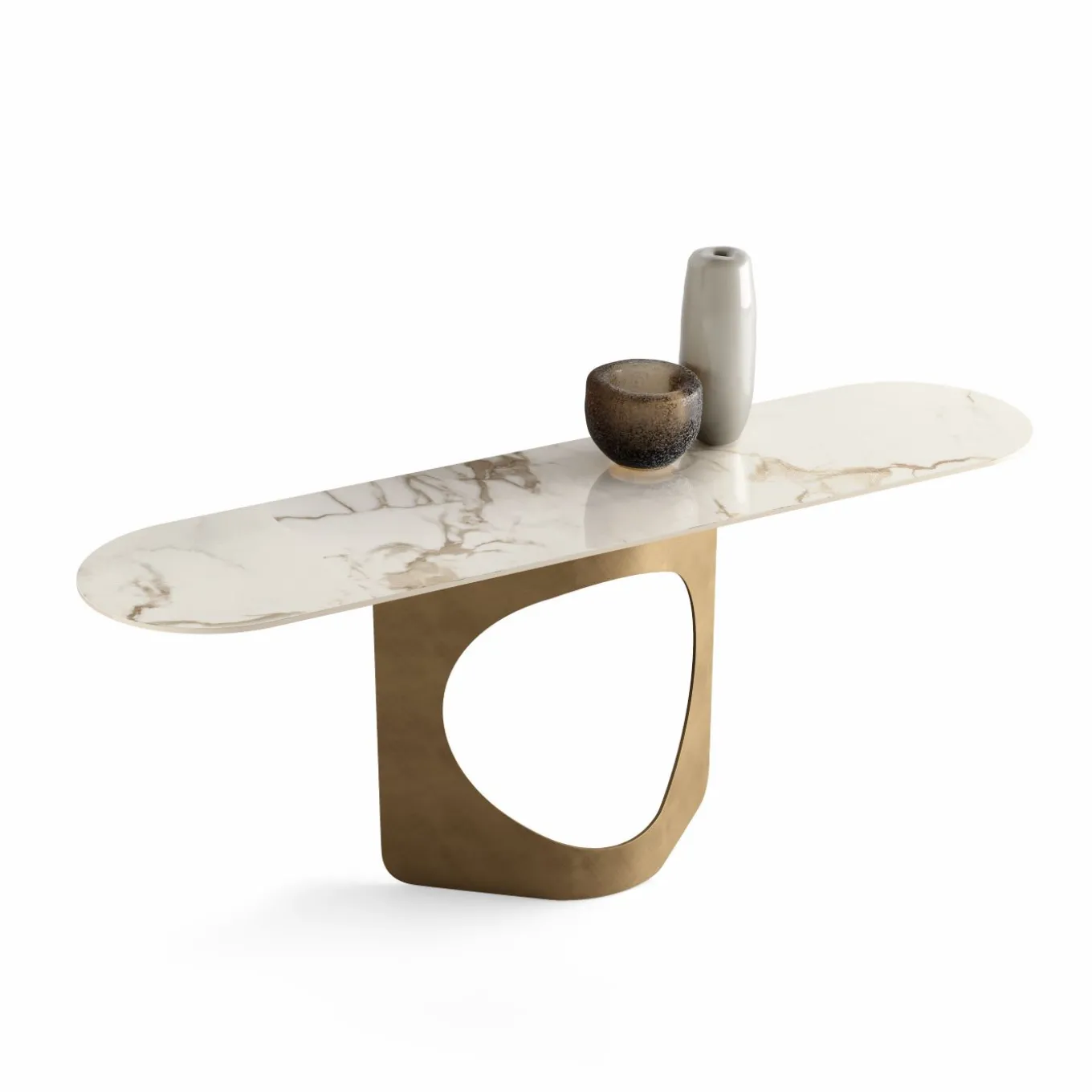 Unmistakably contemporary in fluid lines enriched with geometric accents, this console will find its home in elegant entryways. A 1.2cm-thick stoneware top – boasting a stunning marbled effect that mimicks Calacatta macchia vecchia marble and featuring a full-body edge – sits atop the sculptural bronze-finished metal base, which is curved and refined by a wide cut-out circle of striking visual impact.