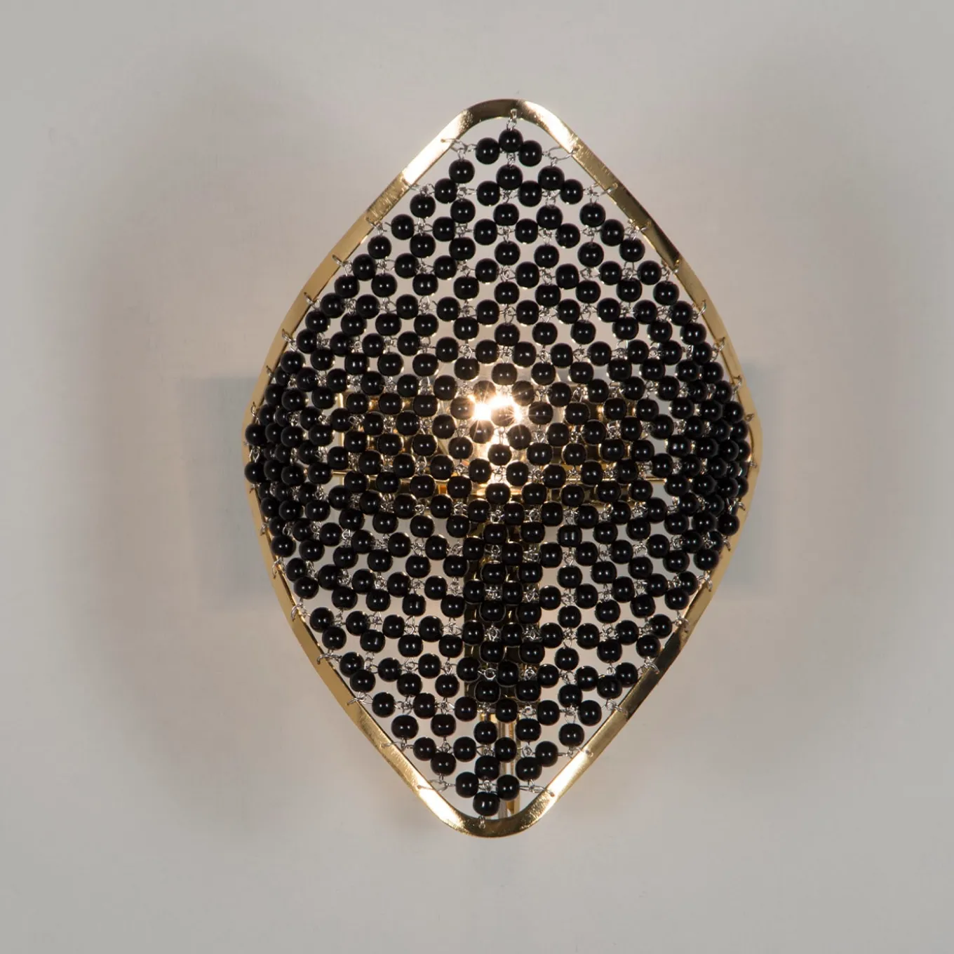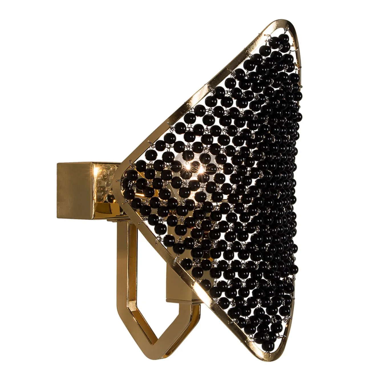 The models are obtained by arranging the rhombuses over ring-like elements of different diameters and reminding them of top-level gold working. The modules, set ajar, look like precious gems variously mounted like bracelets, rings, or parures. The choice of color nuances and metallic finishes is thought always to obtain combinations that glorify the preciousness of the artifact. 1-light wall lamp. Bulb not supplied. Available in custom sizes and finishes. Metal and crystals. Gold plated and black pearls.