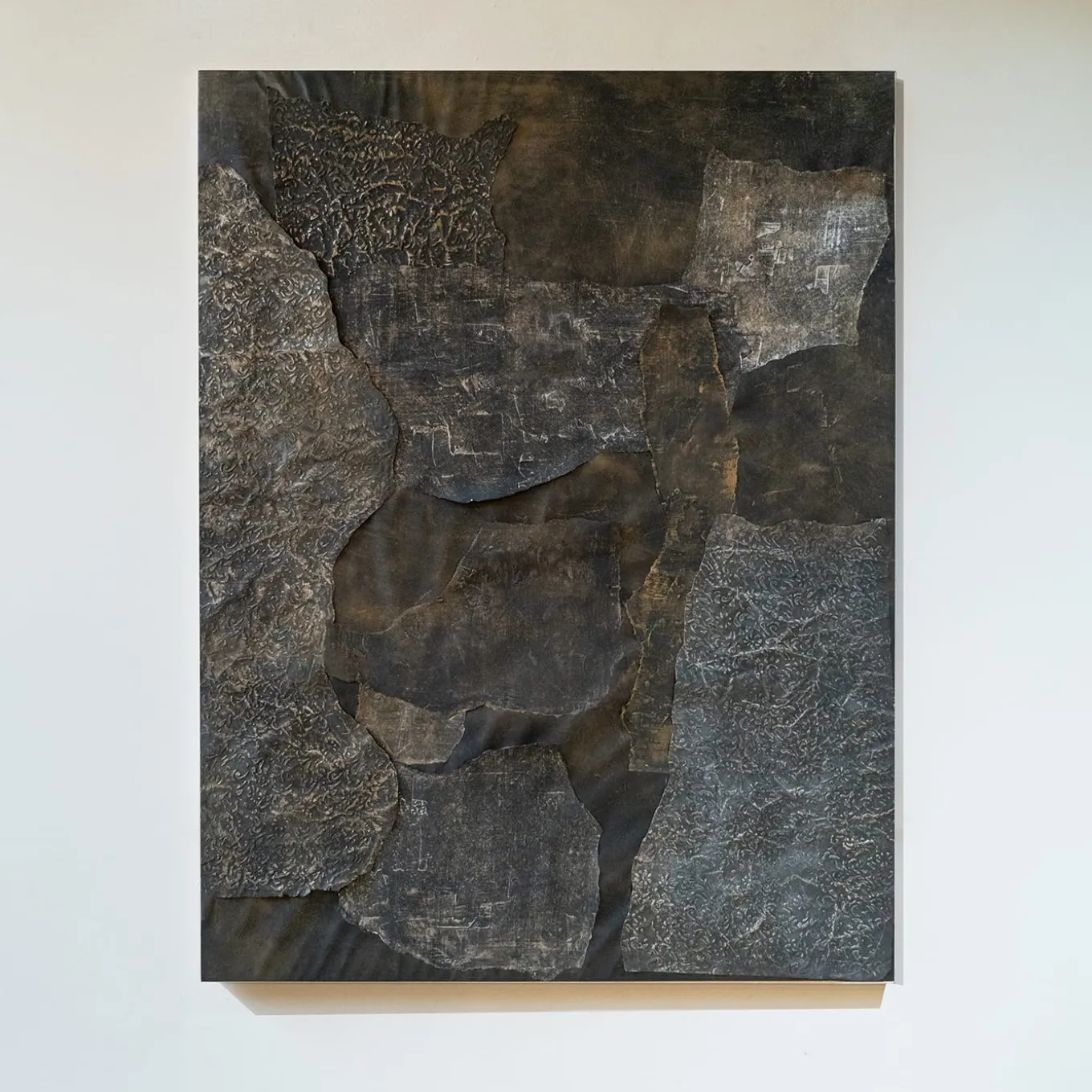 An evocative and mysterious work, slices of papers cut out and painted with metallic mineral powders, layered in a manner reminiscent of turf and soil.