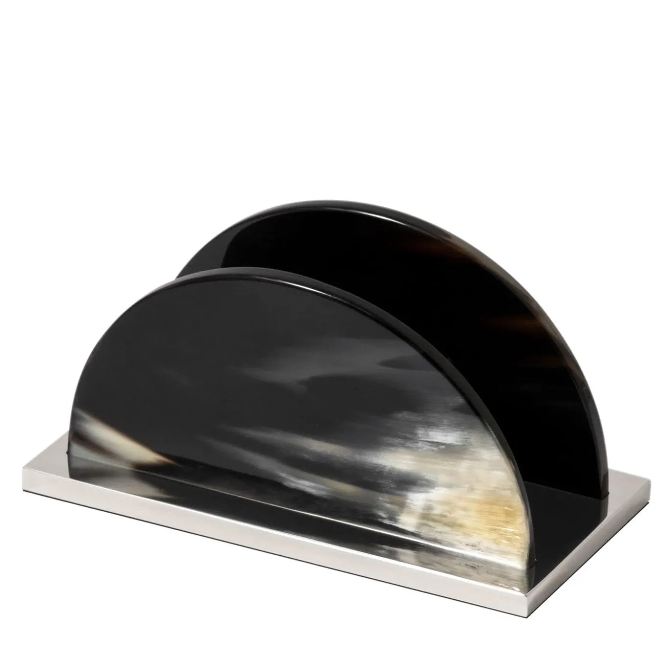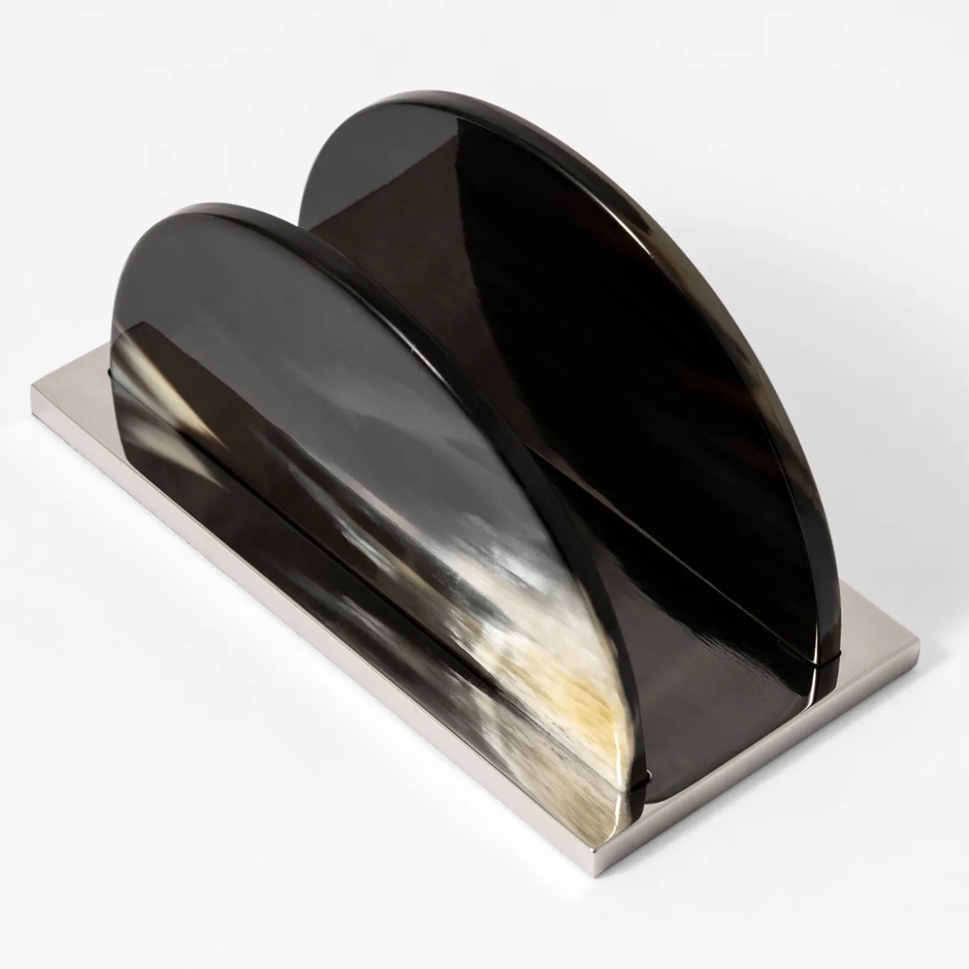 The black horn is shaped into two, demi-lune panels, staggered and set atop a nickel-plated brass base. The horn is polished with wax to bring out its stunning natural properties. Variations in color and striations may vary slightly from the pictured item, to be treasured and appreciated. Delivered in a handmade box with a padded, satin-lined interior. Part of the Weaving Collection.