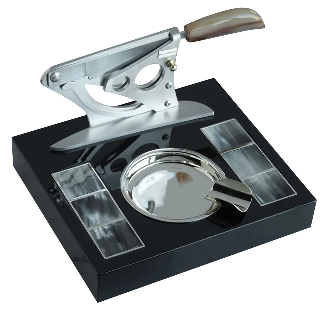 Cigar cutter featuring a high-quality steel blade with a safety mechanism for secure use. The handle is crafted from streaked blonde horn, complementing the lacquered black wood base adorned with a horn mosaic framed in nickel-plated brass. A removable nickel-plated brass ashtray is integrated into the base, allowing for easy cleaning and maintenance. Designed to combine functionality with refined elegance, this accessory suits a sophisticated smoking ritual.