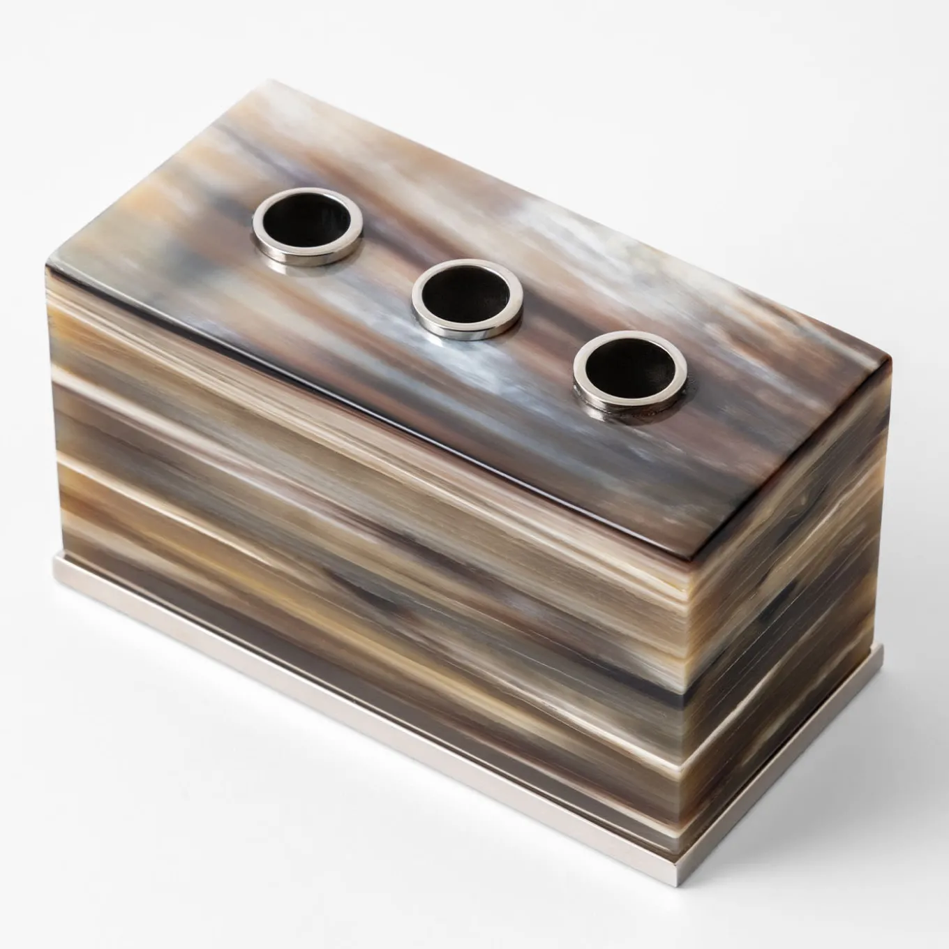 A lavish addition to a desk, either at home or in an office, this pen holder showcases a rigorous silhouette enriched with natural horn that was crafted entirely by hand and finished with natural wax polish to preserve its quality. Its simple rectangular shape enhances the distinctive black, ivory, and golden-brown veining of the prized material, complemented by the nickel-finished brass of the base and accents. An elegant choice to display and keep pens organized, this object of functional decor is an elegant accessory with a modern edge that will blend effortlessly with any interior. Part of the Leonardo Collection.