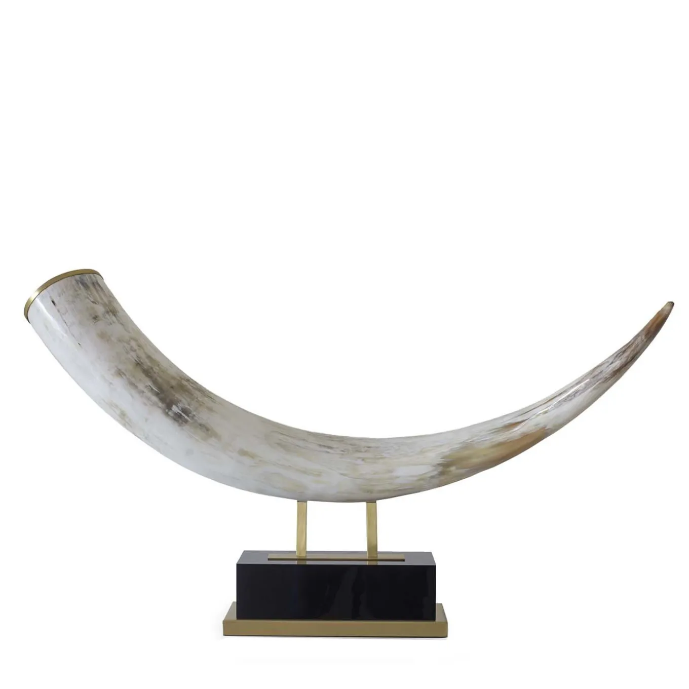 A standalone statement piece that will set the style in any home, this stunning horn sculpture can be displayed on a console in the living room or stately foyer in a traditional and modern interior decor. The support is made of black resin and embellished with a brass base in brass with satin finish that enhances the delicate ivory color with golden veining of the horn on top. This piece is polished with natural wax to preserve the stunning surface of this true one-of-a-kind decoration. Small differences from the pictured item are to be expected as a mark of its genuine uniqueness. Part of the Fidia Collection.