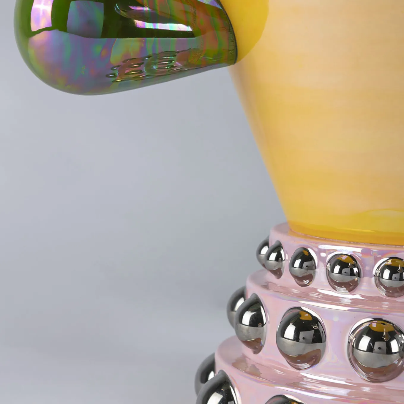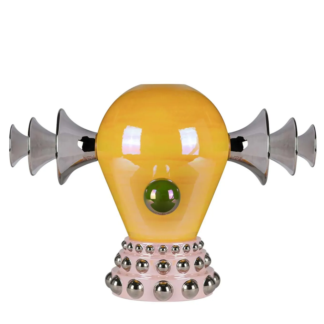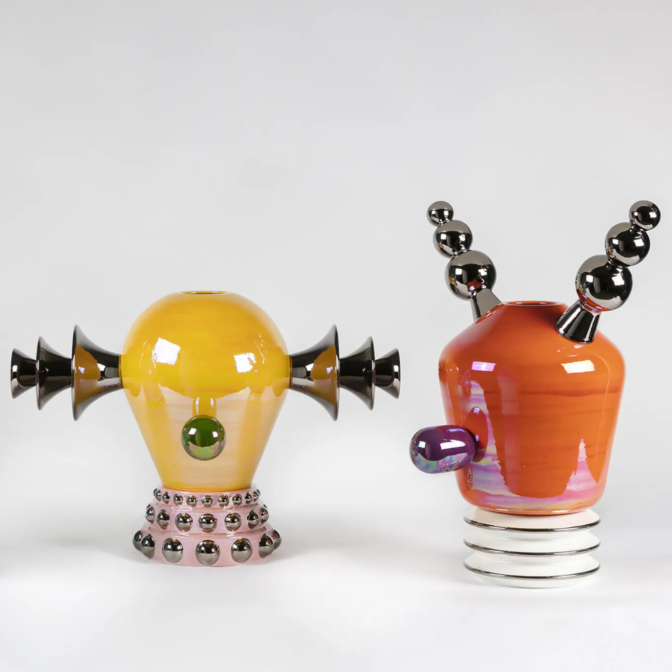 This large vase is inspired by the retro-futuristic images of robots, emphasizing the aesthetics of their mechanical parts and geometrical shapes. Handcrafted in bright colors and a mother-of-pearl glaze, it features detail in platinum and is part of the A Space Oddity collection, made by the most exquisite manufacturer of artistic ceramics in Faenza (Italy).