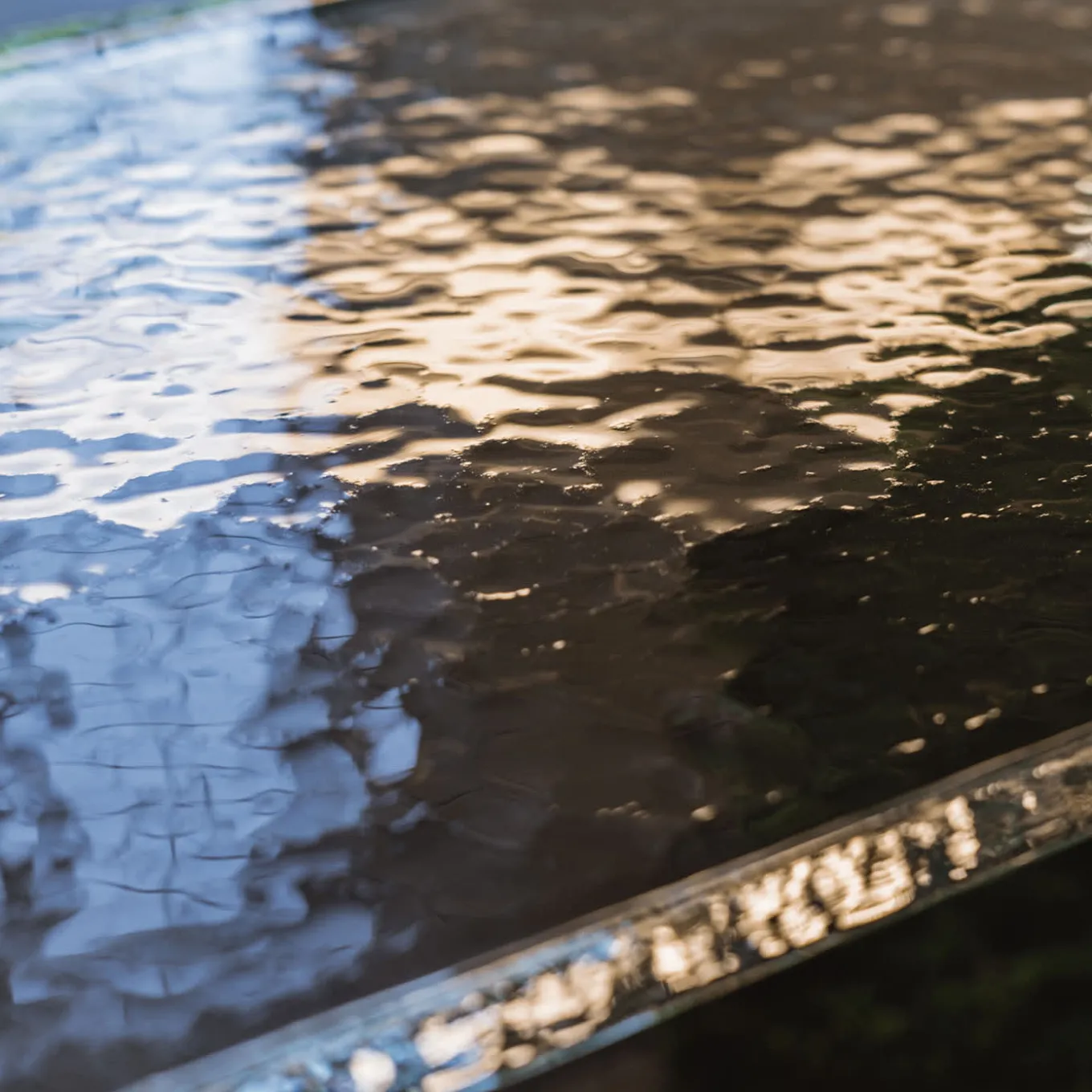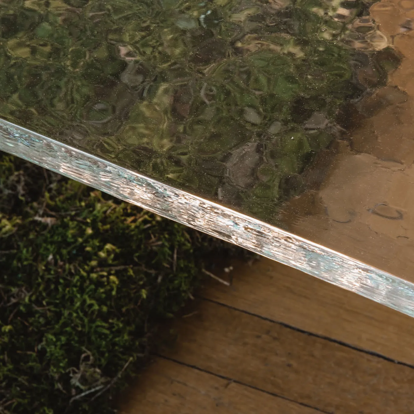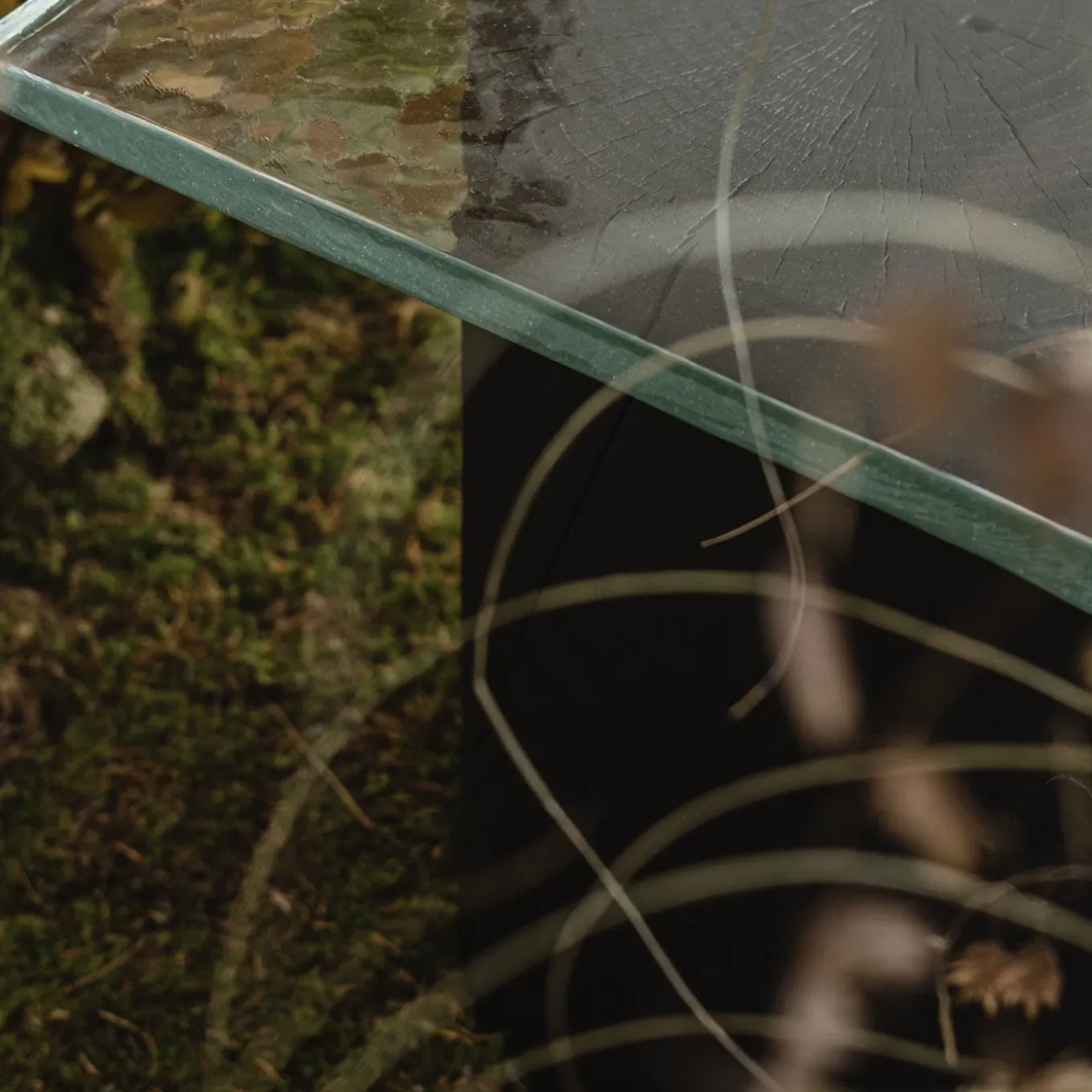 The bench has been thought of as a non-designed object. The intention was to exalt the materiality instead of an extremely researched design. The statuary wooden bases are made using the technique of Yakisugi: the wood is burned removing all the excess material and revealing the wood structure to its core. The irregular geometry of the burned wood dialogues with a geometrical casted glass slab, of which the texture reminds of warm ice.