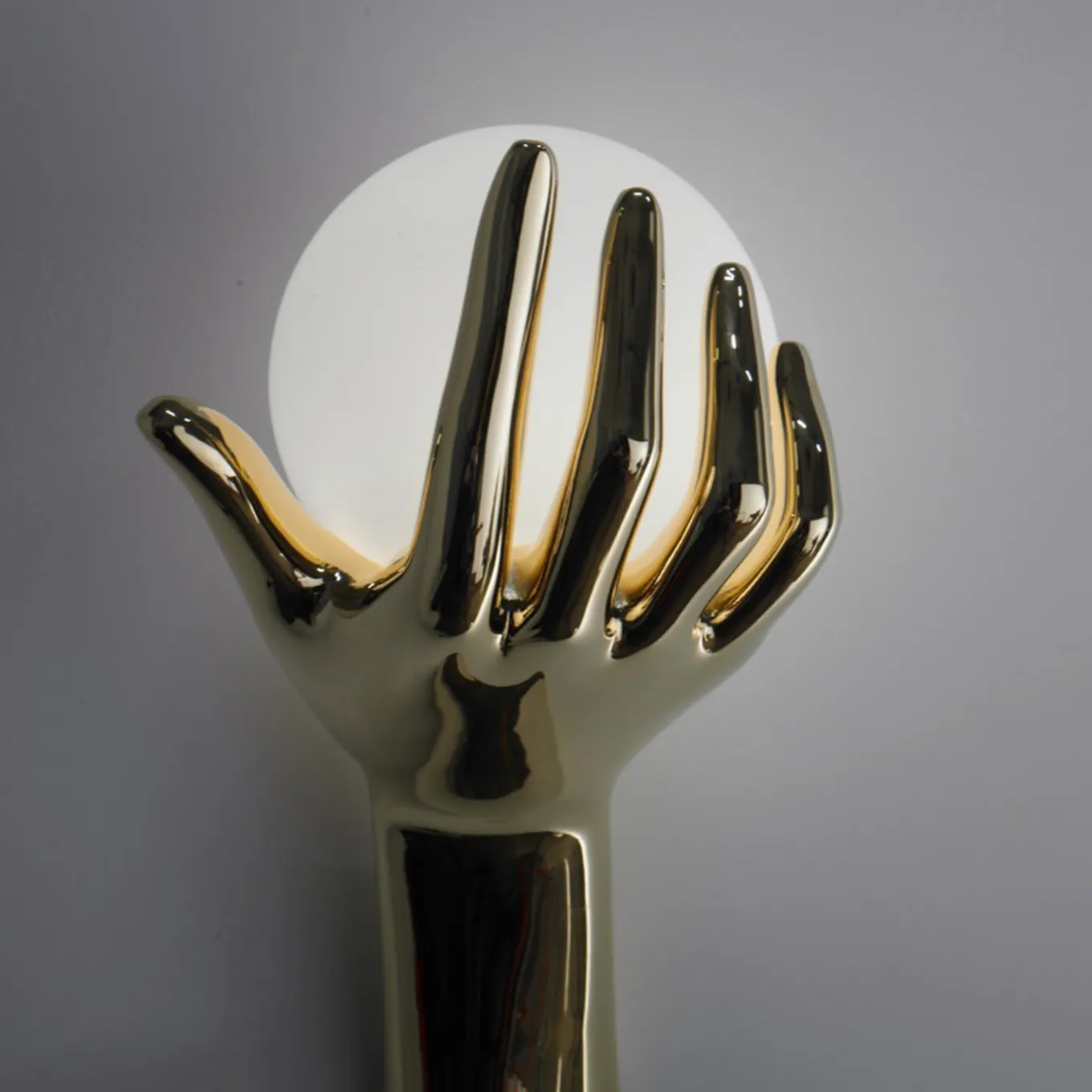 Used in pairs on bedside tables, in multiples along a hallway, or as an accent light in any room, this unique wall lamp is a great conversational piece. The hand holding an opaline blown glass globe housing the light source (1 x G9 max 33W – LED 3.5W) is created with innovative 3D printing. The techno-polymer shape is generated and, after a metal stratification process, it finished with 24k gold plating. Available in other finishes that can be grouped together, this wall lamp will surely be noticed. Recommended voltage 220-240V or 100-120V. Contract and commercial certifications available upon request.