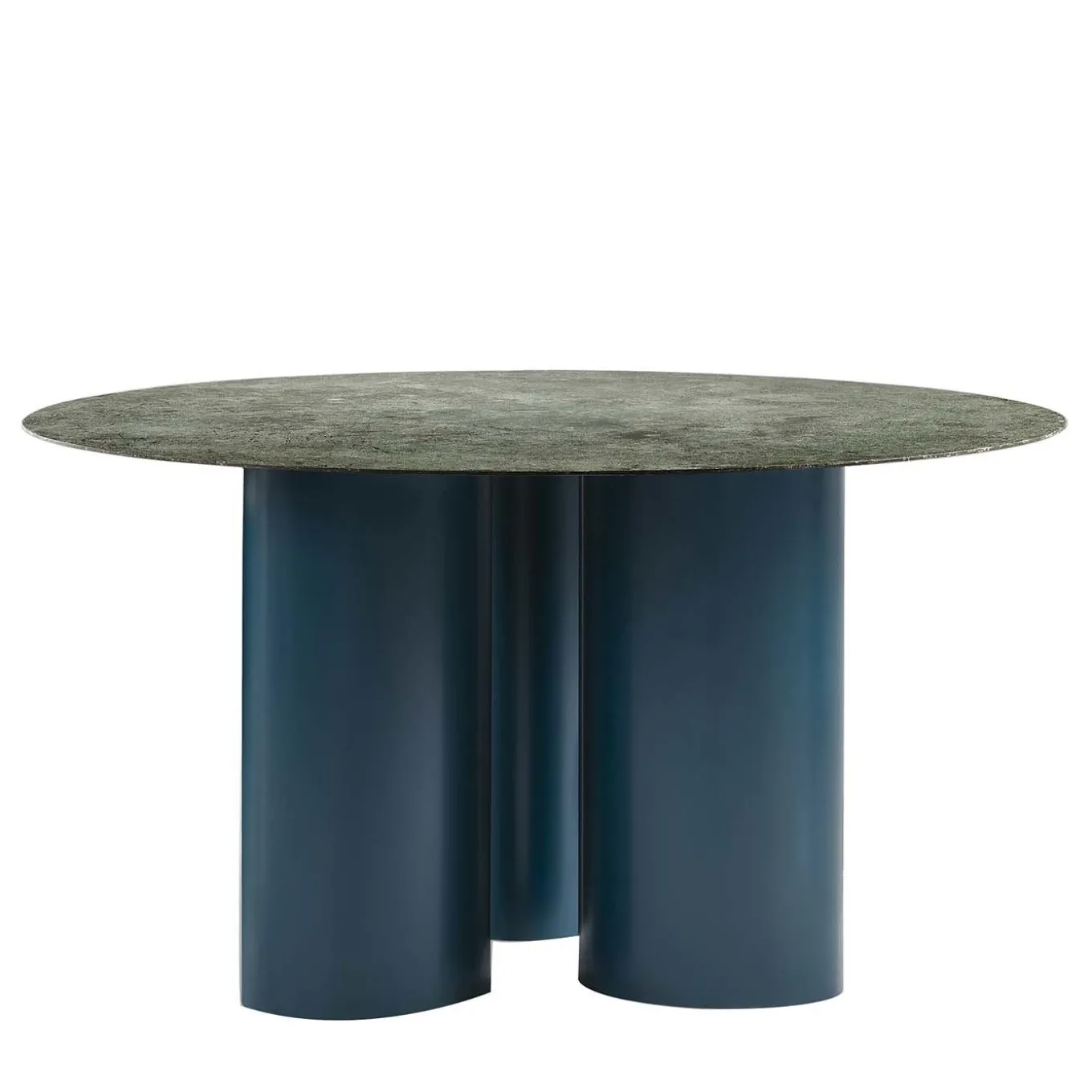 This indoor-outdoor dining table features a superb base composed of three cylindrical elements supporting a round top in a mesmerizing interplay of geometric lines. Both base and top are made of steel, the top with a dark grained finish and the legs in a smooth blue-green. Customization in other colors and finish (smooth or textured) is available, and the top can be realized in the following sizes: Ø 160 cm; Ø 180 cm; Ø 200 cm. Please ask the Concierge for pricing in the selected options.