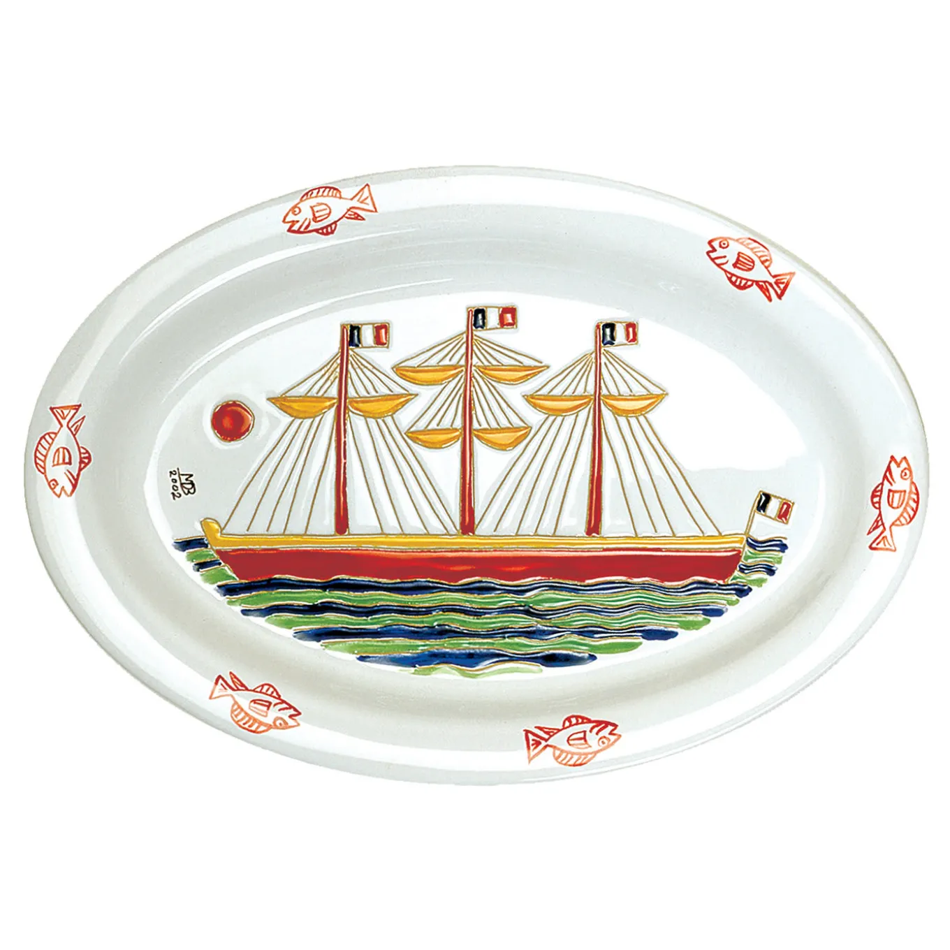 An exquisite celebration of Sardinian sea life, this striking oval tray is entirely handcrafted of fine ceramic and boasts a handmade decoration using the graffito technique whereby colors are incorporated into the ceramic by scratching on the surface. A Mario De Biasi design, it will infuse refined sophistication in any decor.