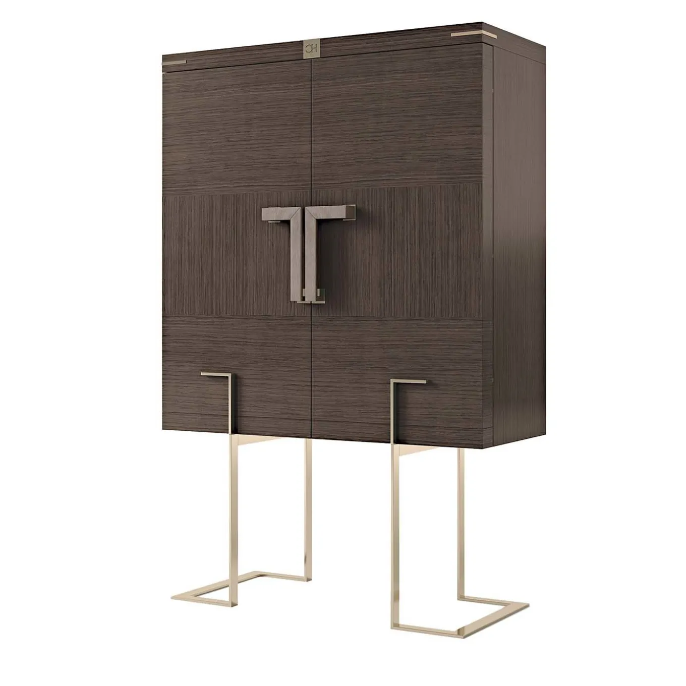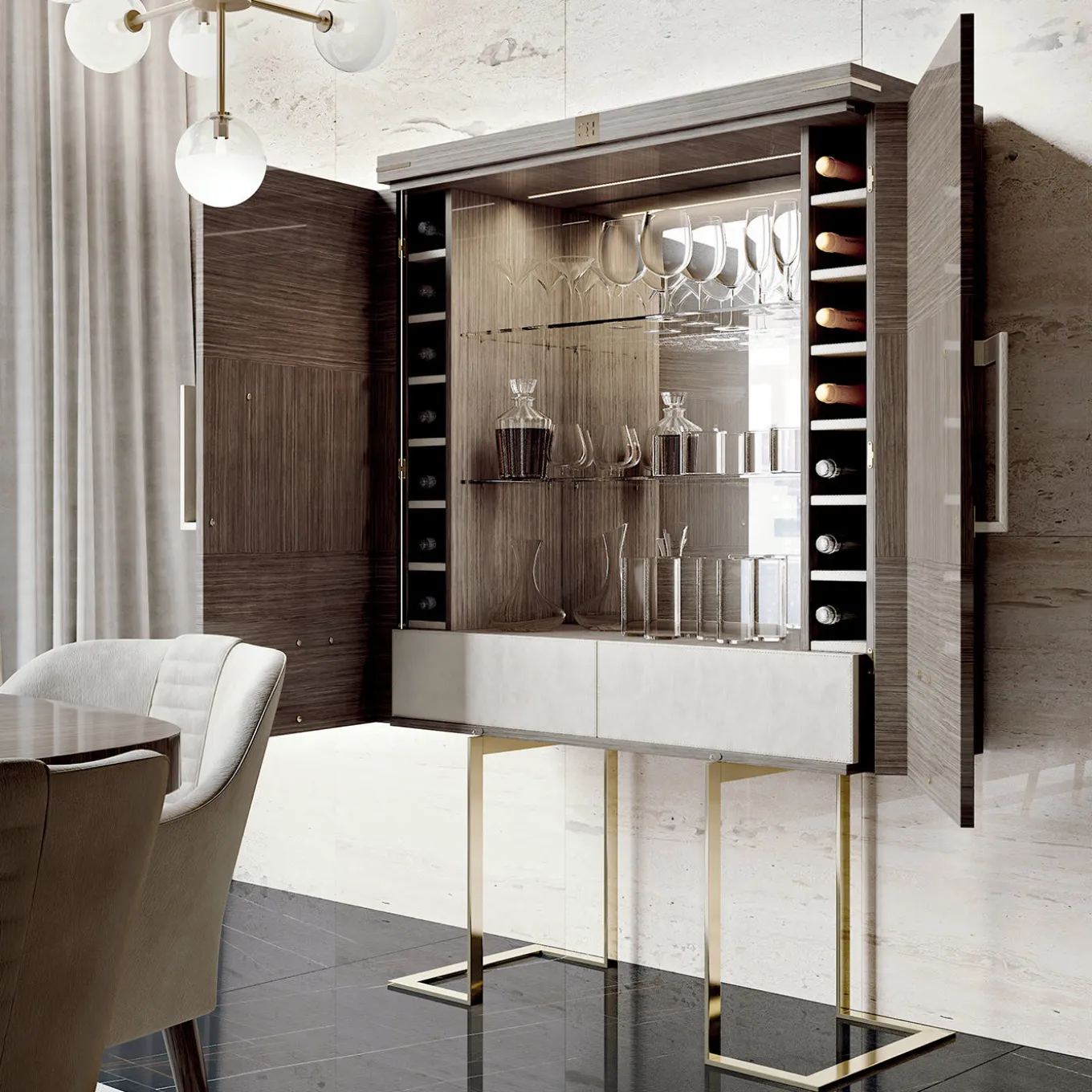 Two doors Bar with metal base. The beautiful mix between natural Ardesia Walnut wood and golden galvanic metal details is perfect for a Contemporary and luxurious environment . On the inside, a seamless mirror reflects the light from an LED light stripe perfectly inserted underneath the top. With its crystal shelves and the two upholstered drawers allow plenty of storage space for precious items. The handles are covered in econabuk with golden galvanic details. Please ask Concierge for customization options.