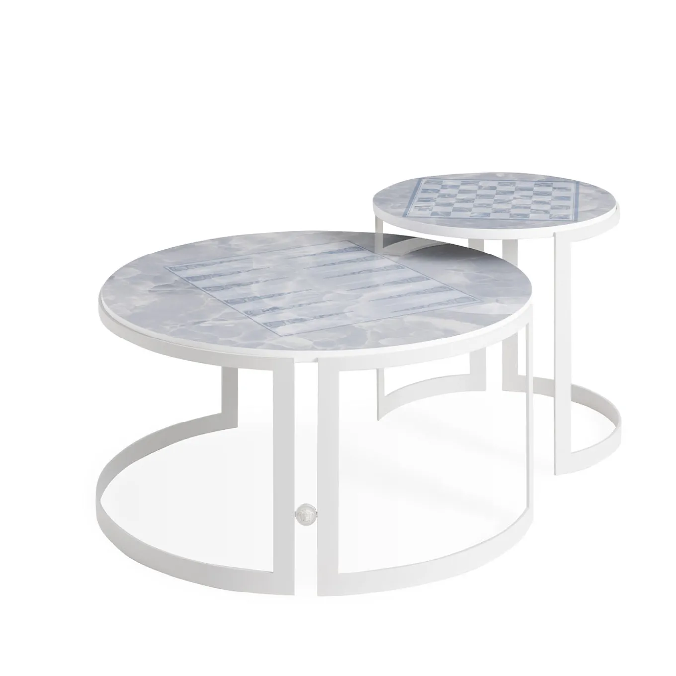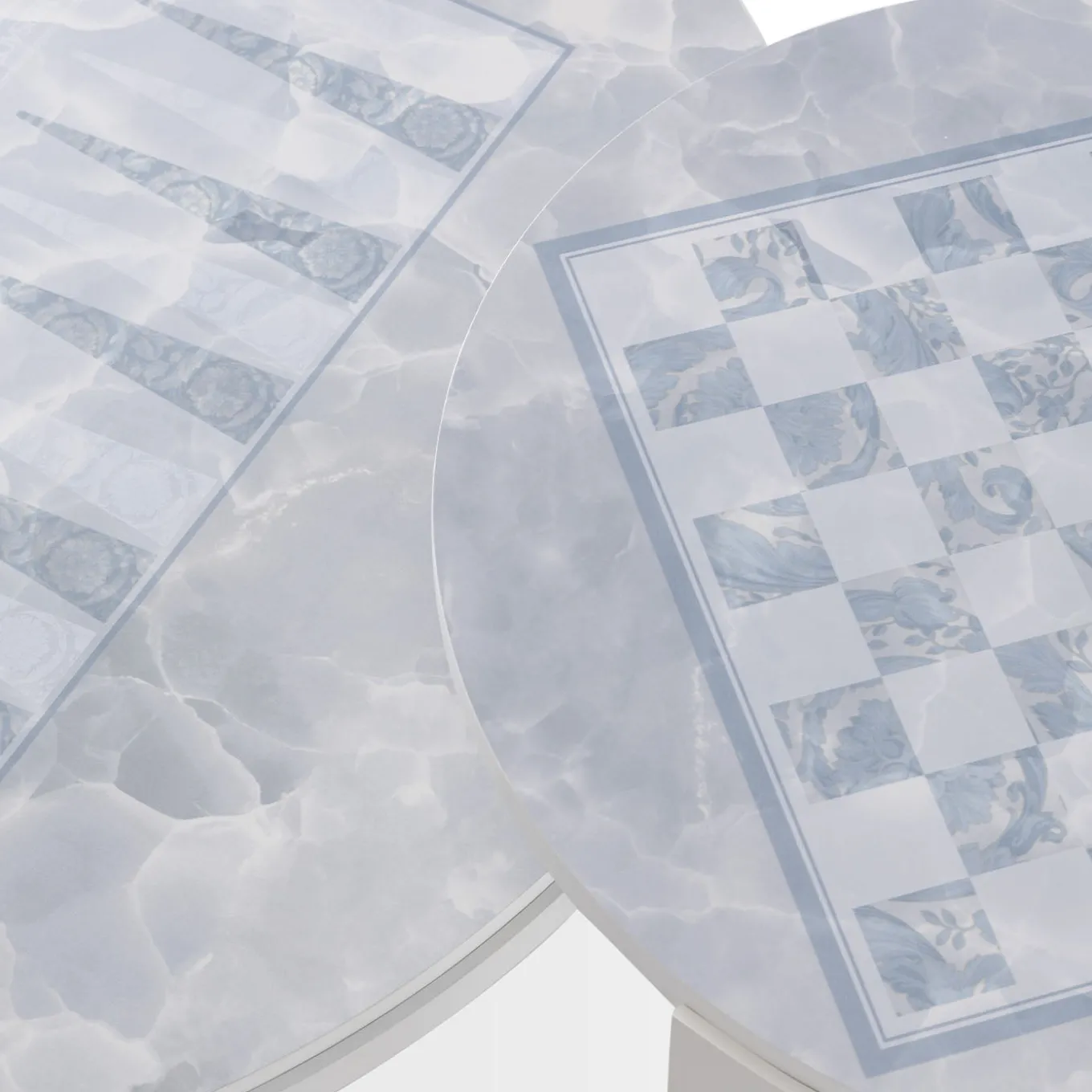 The Iconic round side table features a gres porcelain top with a distinctive chessboard pattern, supported by a white soft-touch painted steel frame. The structure highlights a 3D metal Medusa logo with coordinated finishing, blending minimalist design with luxury. Designed for outdoor use, it complements various settings while offering enduring style and comfort with its refined materials and elegant geometric motif. Limited Edition. Also available in a sleek black soft-touch finish and with a variety of top options. Contact the Concierge for further information.