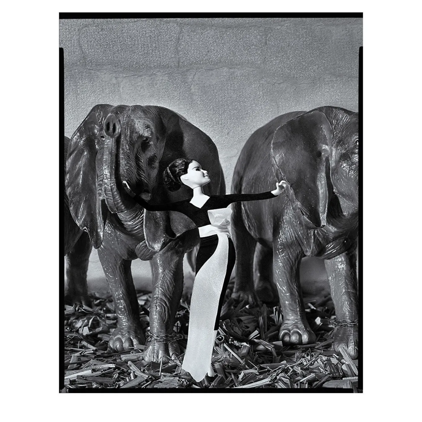 A faithful restaging of the iconic Dovima with Elephants shot Richard Avedon took for Dior is captured on this Giclée print on Photo Rag. Minute attention to detail coupled with a woman with a Barbie doll reveals the mastery of the photographer and symbols of contemporary Western culture. Contact the Concierge for the frame’s availability and pricing.