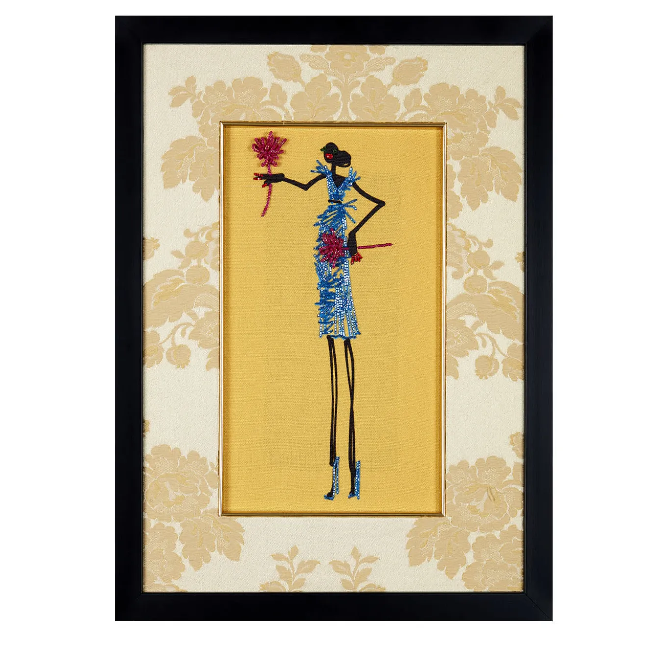 An elegant female figure holding a bouquet against a bright yellow backdrop defines this superb embroidery. Jais and cutdana glass beads enrich the printed linen base, creating a decorative twist with a visual and tactile appeal. Sky blue, must-toned, and red threads intertwine in minute embroidery of singular artistic value.