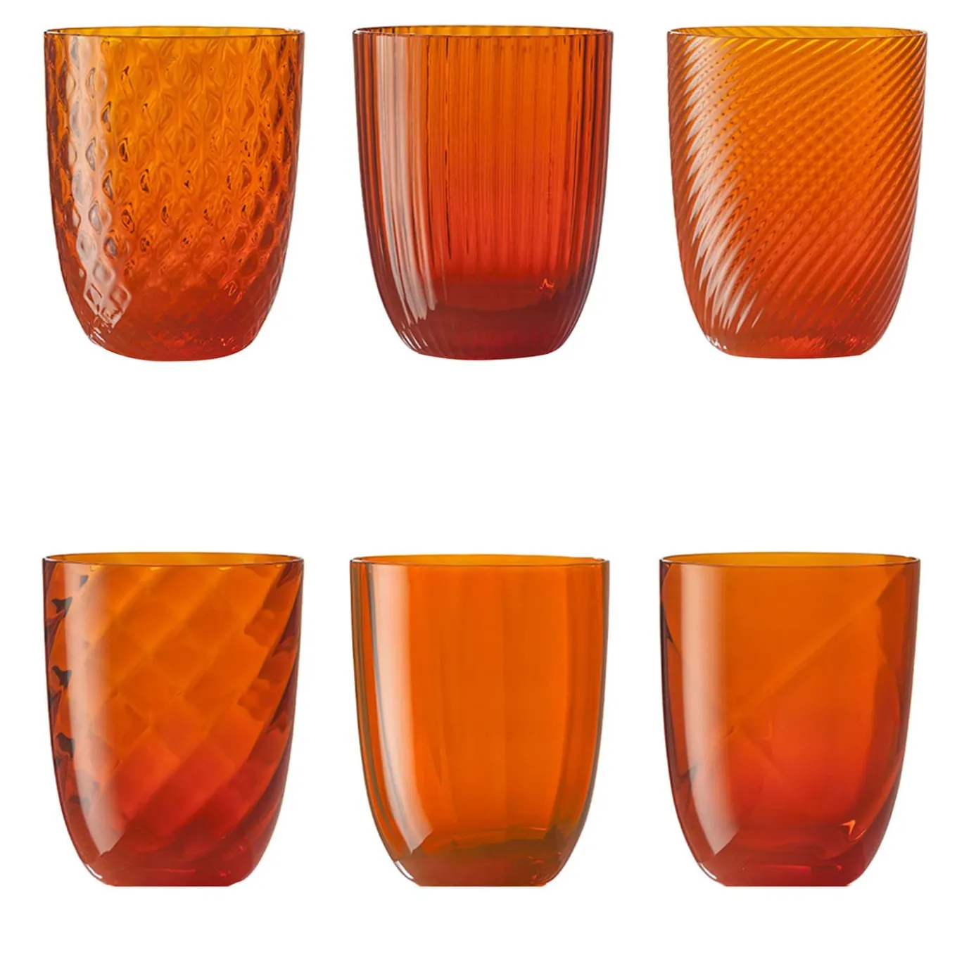 A radiant orange tone pools together the six water glasses in elegant assorted textures composing this precious Murano glass set. Painstakingly mouth-blown, each glass sports a different design obtained by specifically following techniques from the Muranese tradition, namely lente, ottico, ottico torsé, balloton, rigadin, and torsé. Multiple color options are available.