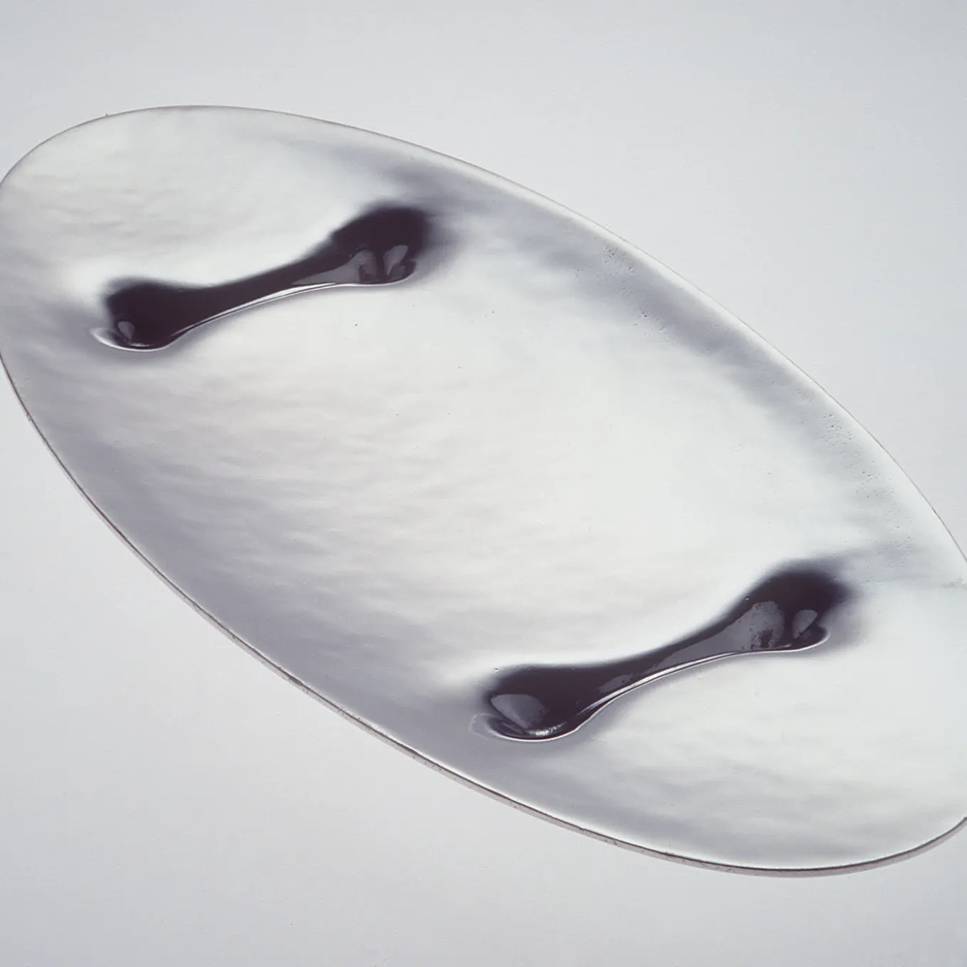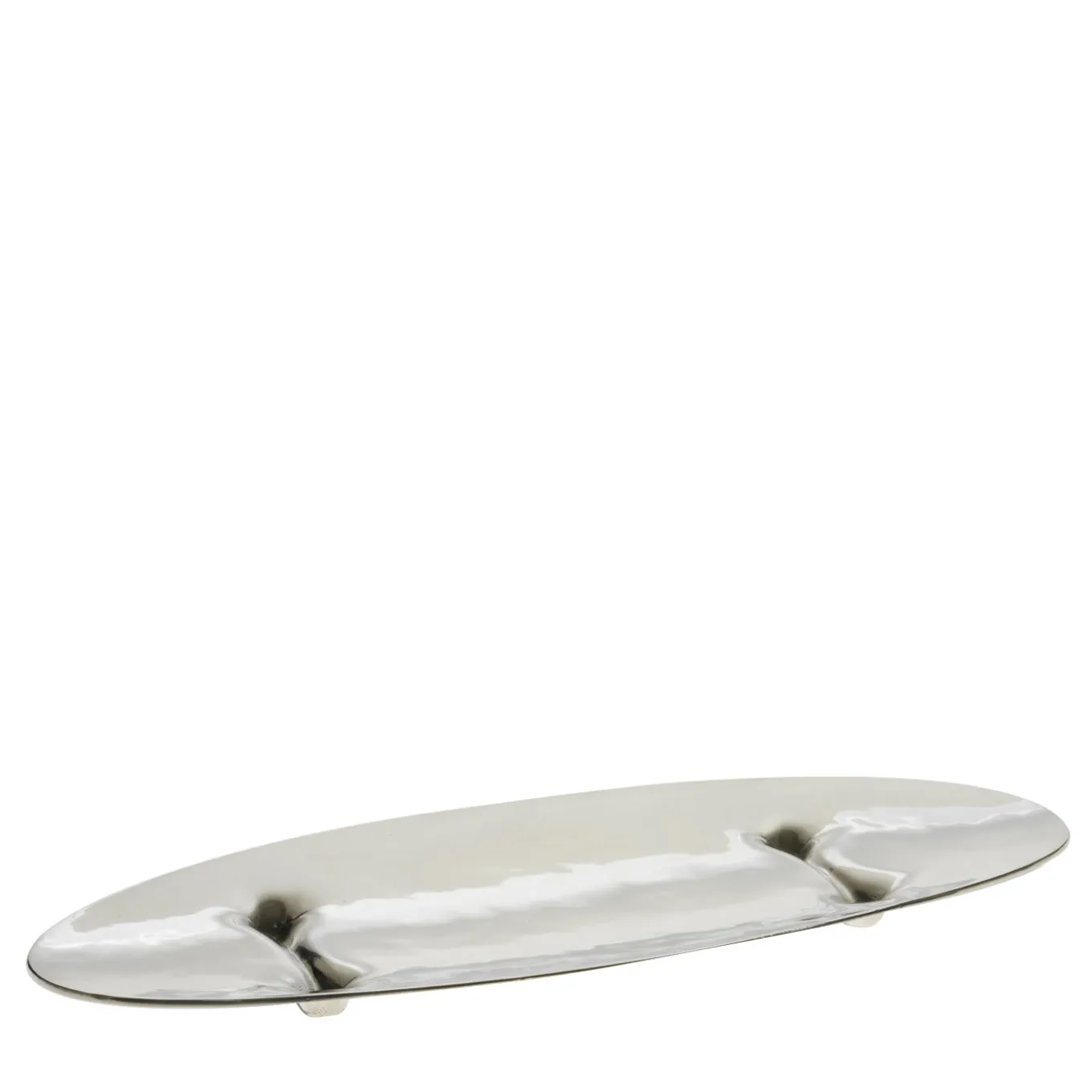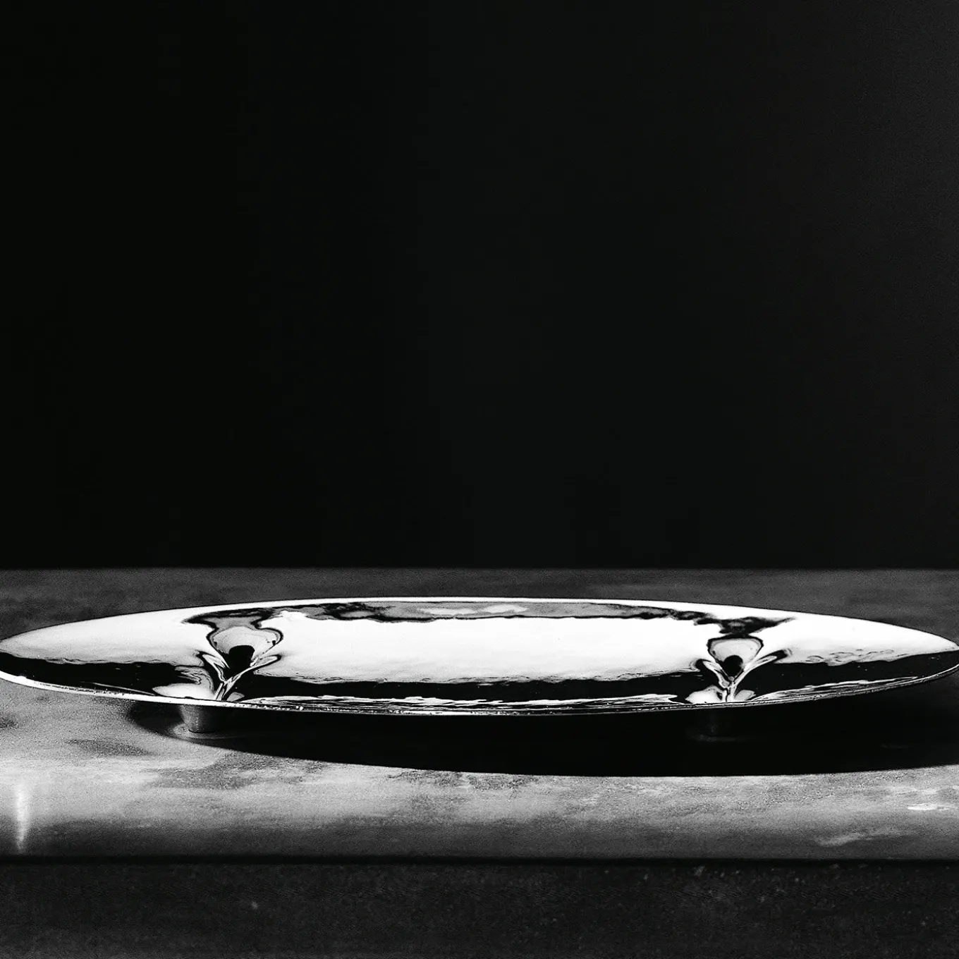 Stunning in its contemporary flair, this tray is a limited edition piece from the Metallia Project designed by Tamar Ben David. Superbly crafted of pewter and polished by hand, its oval silhouette is marked by two concave elements – recalling a sinkhole – that form on the exterior the convex supporting base allowing for greater stability.