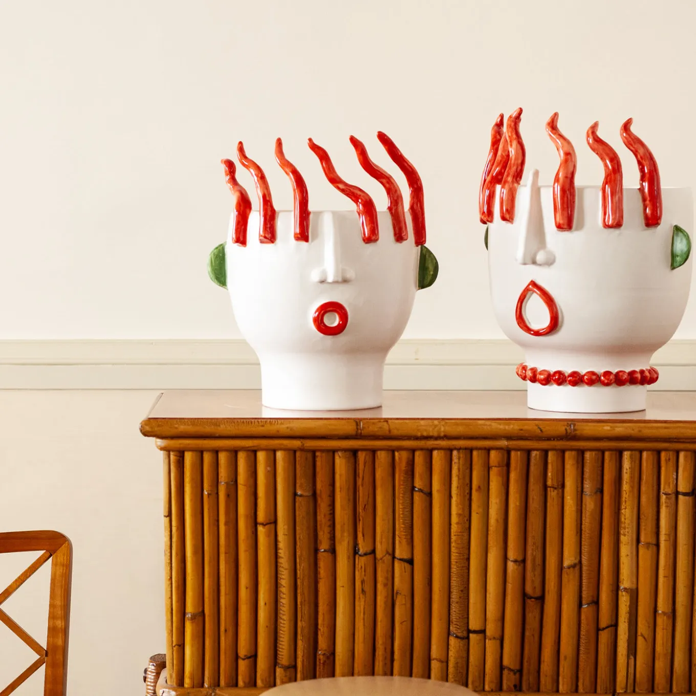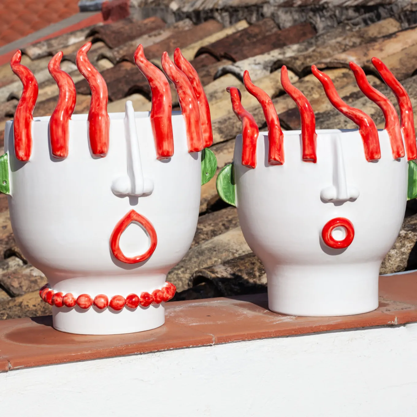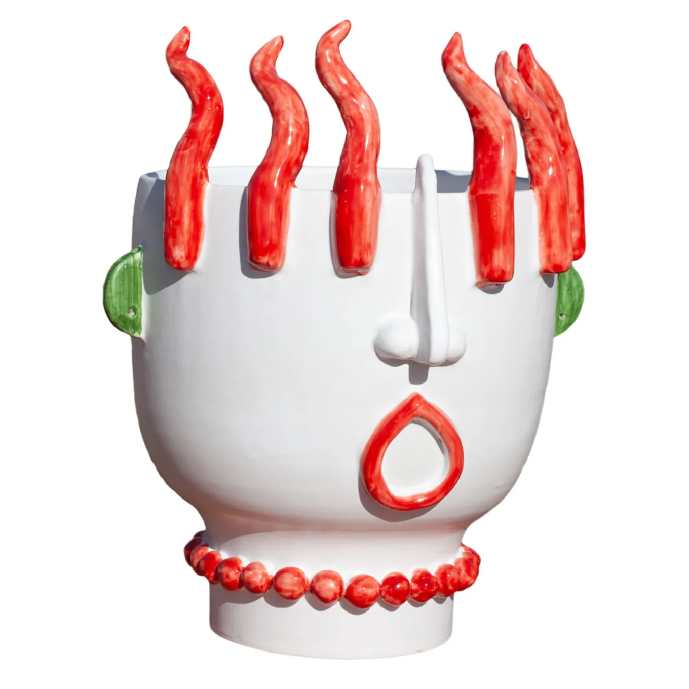This striking sculpture/vase results from the impeccable mastery and visionary sensibility of ceramist Patrizia Italiano that personally handcrafts each piece. Part of a series dedicated to Sicilian street vendors, this superb anthropomorphic piece in prized white ceramic is an ironic homage to a female street vendor of peppers, featuring ears accented in green, and necklace, lips, and a crown of peppers painted in vibrant red.