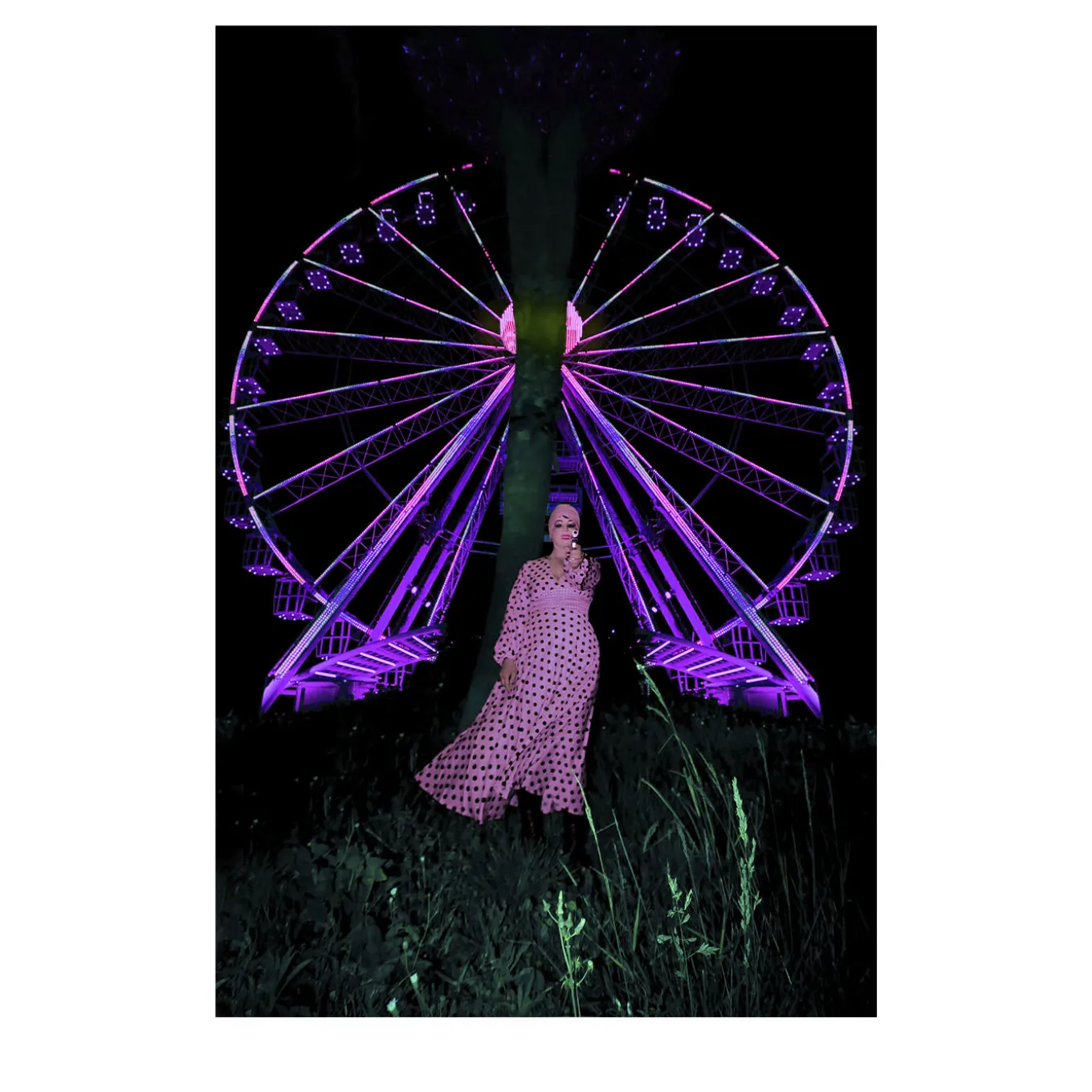 “Demon under the Skin” is a series of vividly colored photographs portraying strong and unconventional female characters, rising from a hurting past that allows them to see the light. Here, a lady in pink points a gun at the viewer, a purple Ferris wheel on the backdrop. Please consult the Artemest catalog for other available photographs from this unique series.