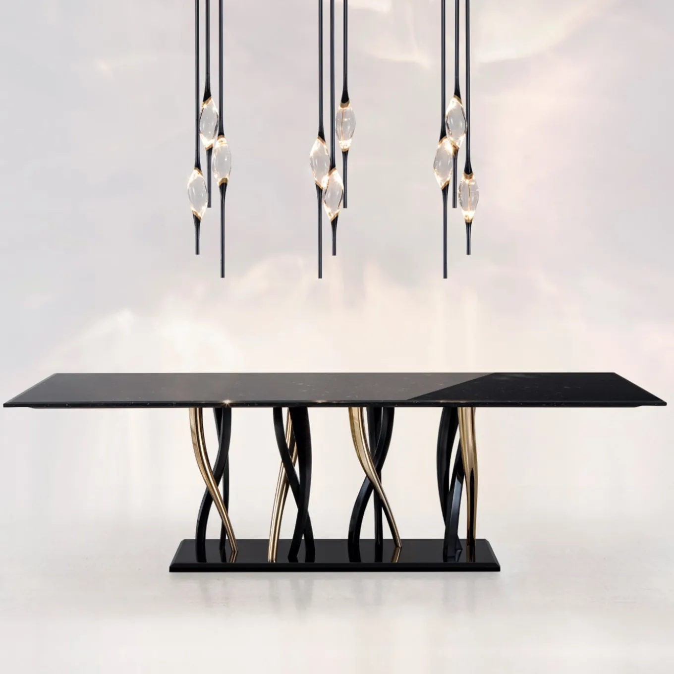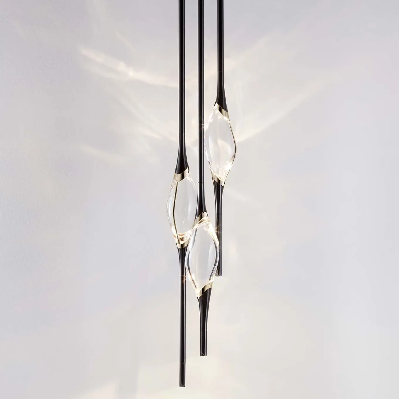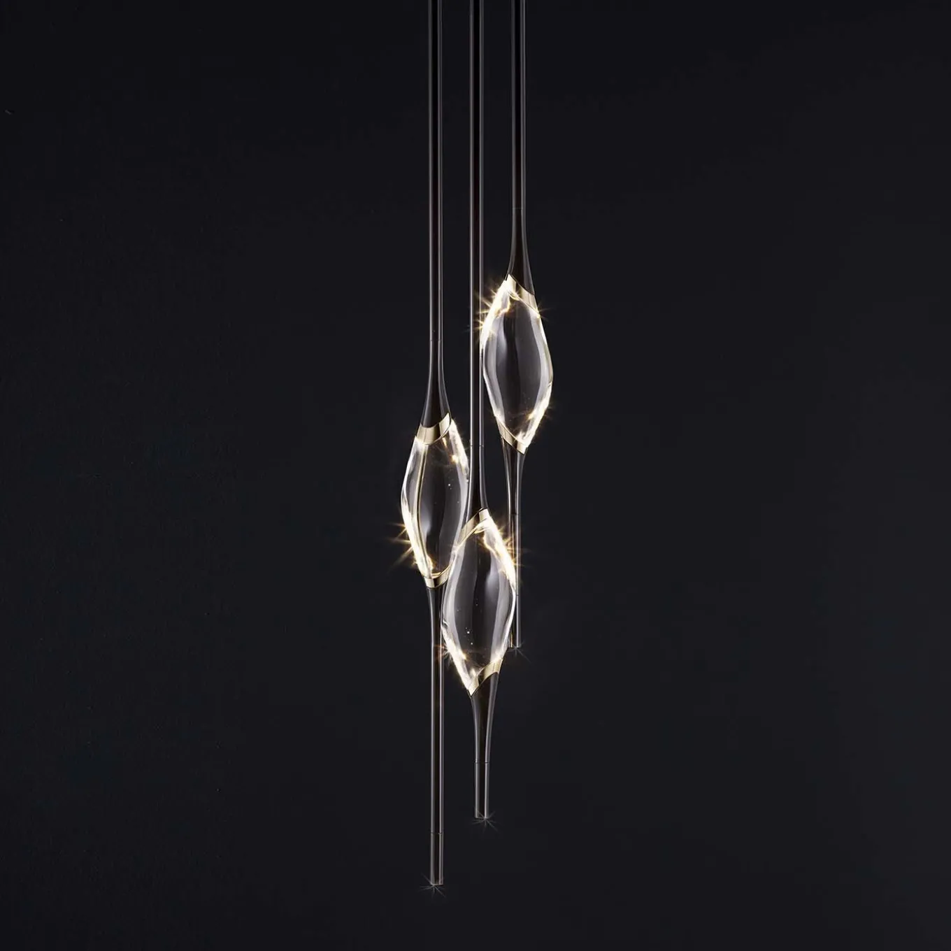 Il Pezzo 12 Round Chandelier features three solid, transparent crystals illuminated by two LEDs, casting soft, diffused light and captivating reflections. Each crystal is suspended between black stems and cast brass rings with a gold finish. An additional LED at the stem’s tip emits warm, direct light. Numbered and marked with the (“Pezzo Mancante”), a brass cylinder with a unique serial number, this chandelier is fully customizable in size and finish to suit any style preference.