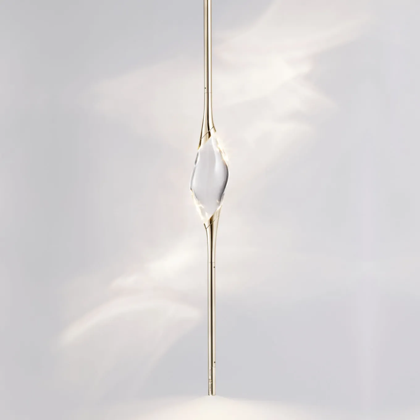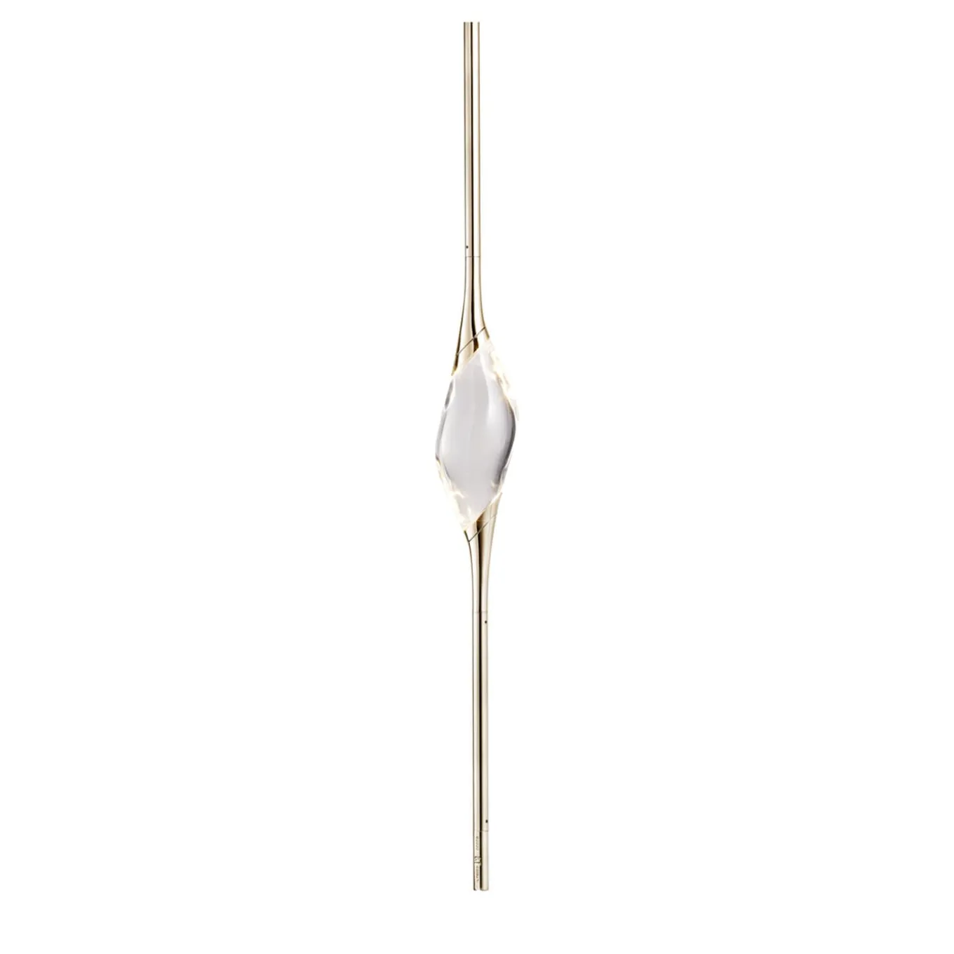 Il Pezzo 12 Pendant, designed by Cosimo Terzani and Barbara Bertocci, features a delicate figure suspended in the air, carrying light. It exudes nimbleness and refinement and it includes a unique identification stamp for authenticity. Crafted from the clearest solid crystal, the pendant is illuminated by three LED lights, producing for diffused ambient lighting. Suspended by brass stems and casting rings, it is available in various finishes. Please contact the concierge for details.