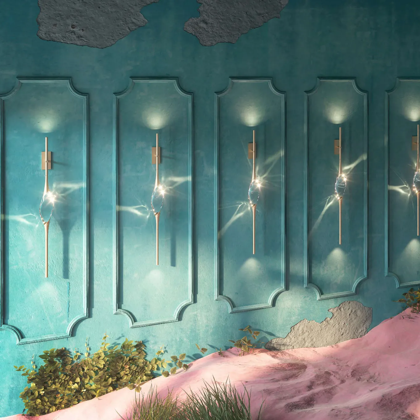 The solid clearest crystal, suspended between brass stems and brass casting rings in gold finishings, Il Pezzo 12 Wall Sconce creates diffused ambient lighting. At the top and end of each stem, two LEDs spread a warm direct light.Each lamp is numbered and hides its own identity stamp that seals and guarantees the authenticity and uniqueness.Available in custom sizes and finishes.