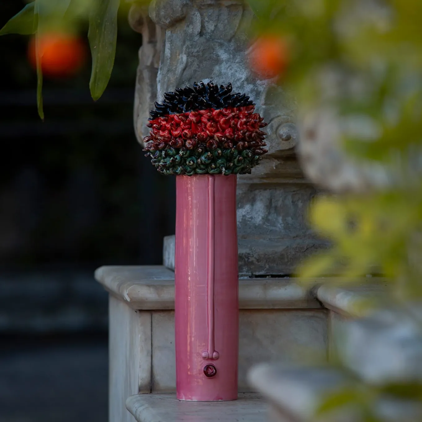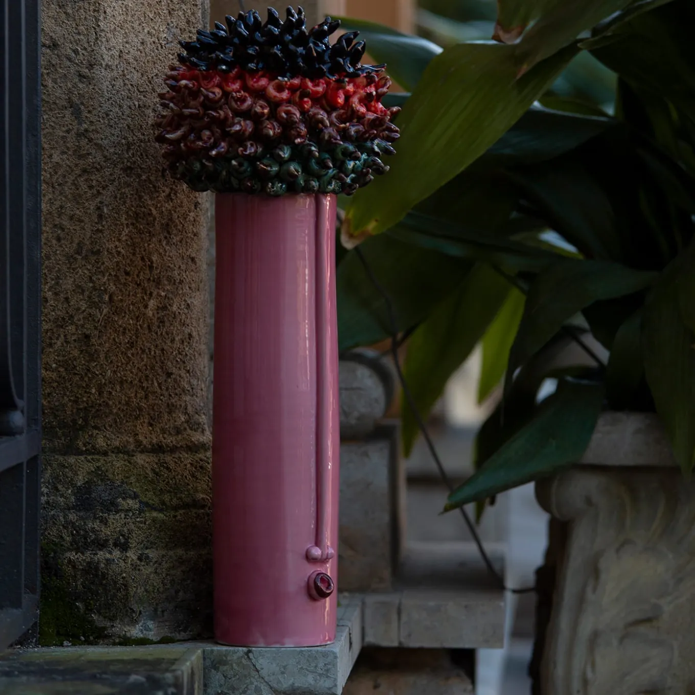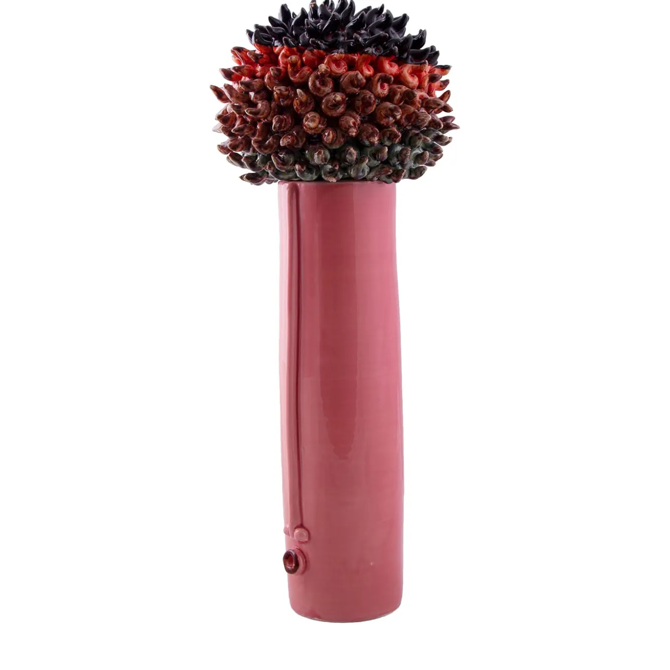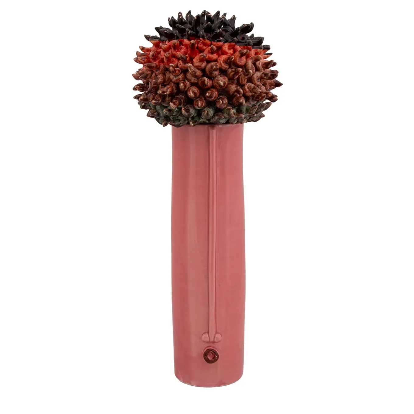 The hedgehog is a long vase consisting of a body and a lid. This object is entirely handmade in white clay and many colored crystallines.