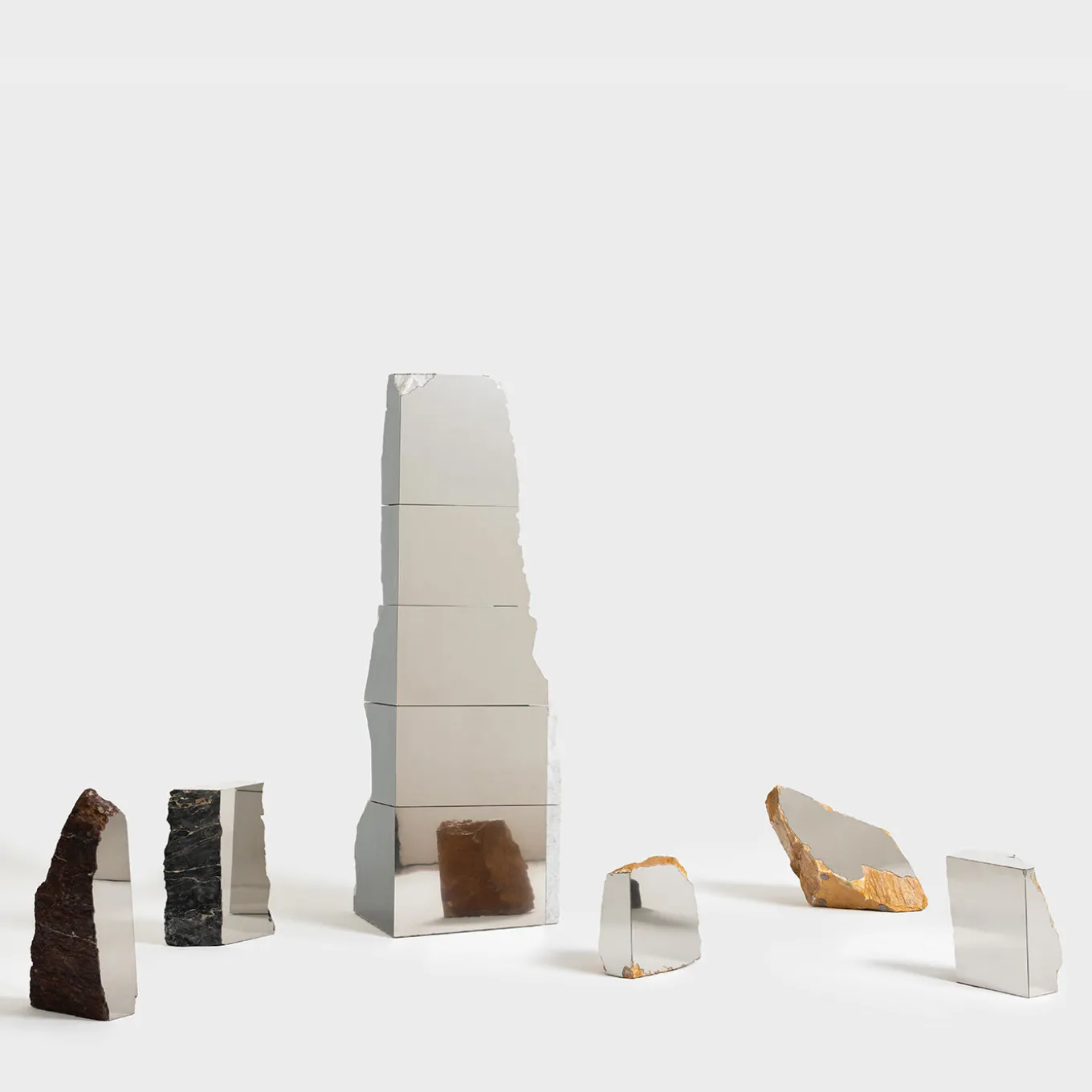 This mirror by designer Duccio Maria Gambi merges raw natural stone with polished reflective steel, creating a striking interplay between texture and light. Each piece from the Immersione collection is crafted from a single found offcut marble slab, retained in its organic form and paired on its flat side with a mirrored steel surface that seemingly dissolves the stone’s mass. This mirror evokes a dynamic visual exchange, blending solid material with its environment through reflection and contrast.