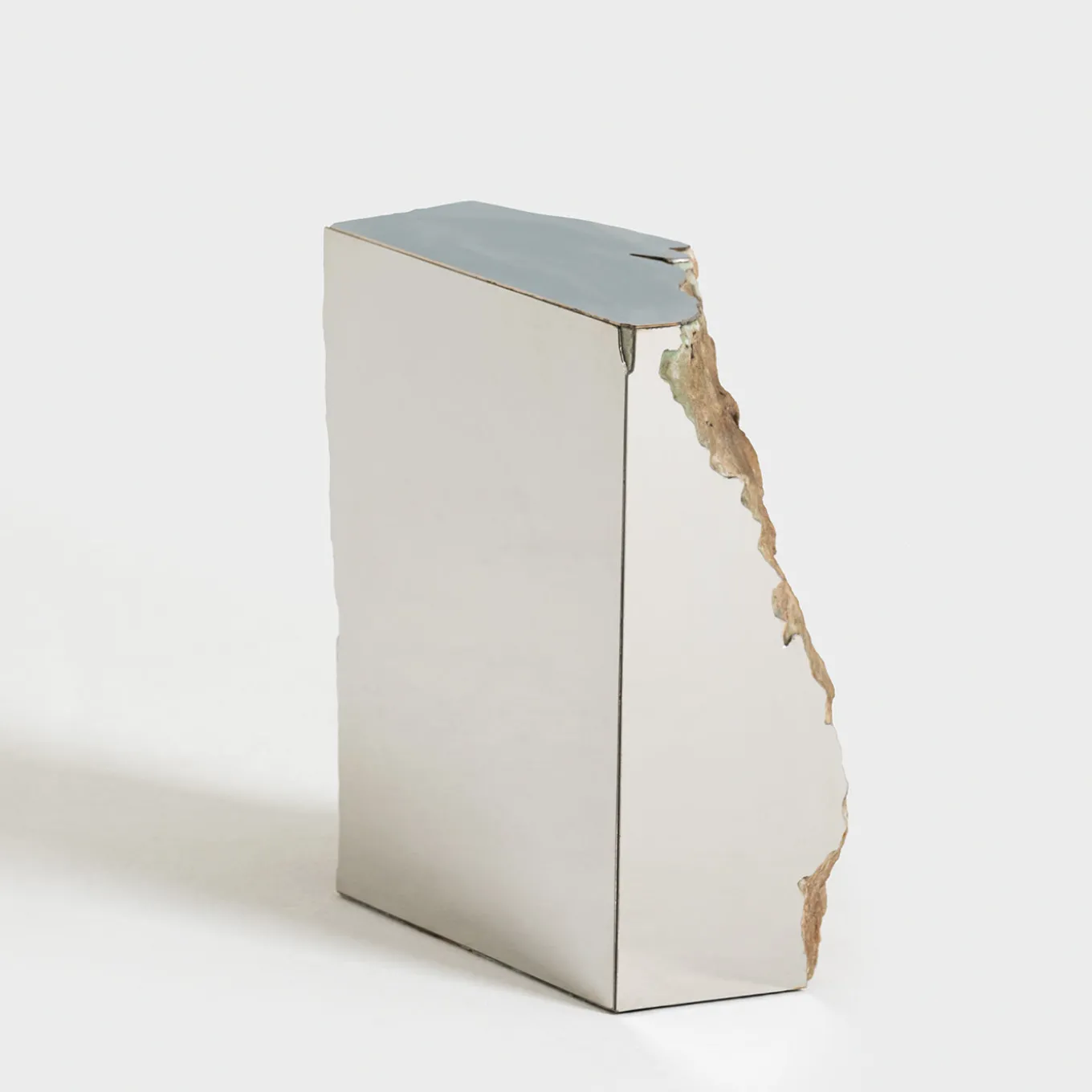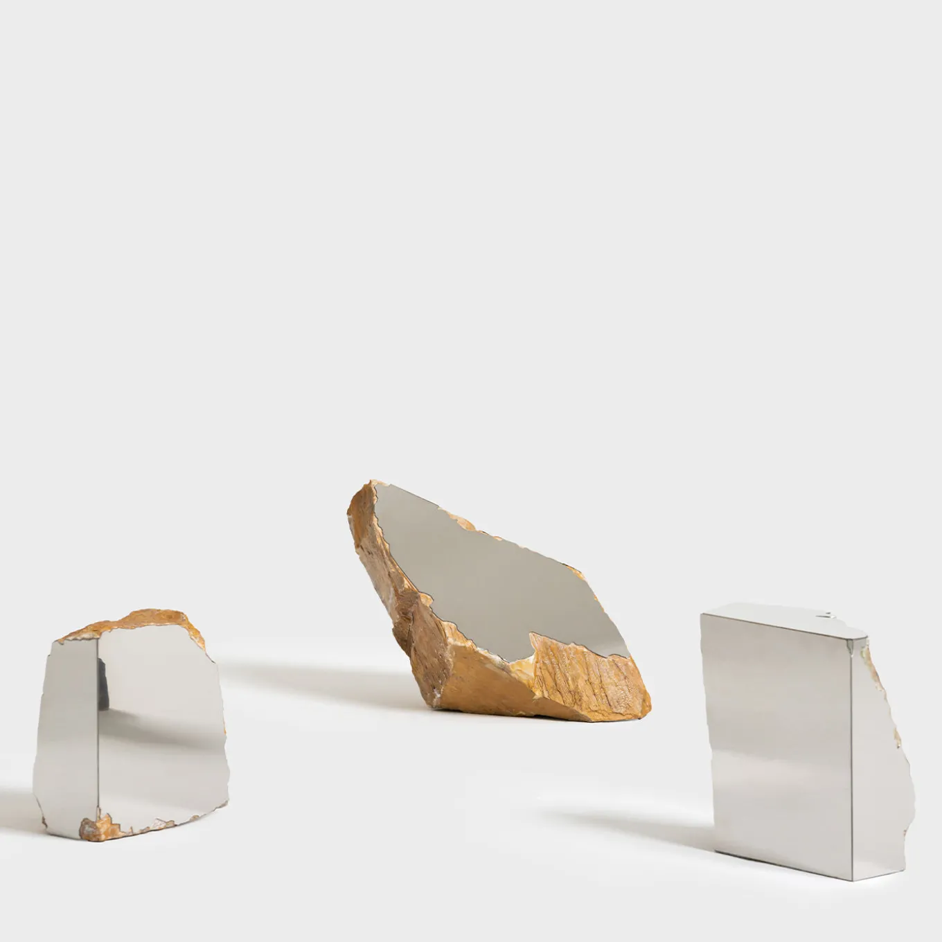 Immersione mirror features a single piece of found offcut stone with a reflective steel sheet affixed to its flat side, creating a striking contrast between the raw, textured natural surface and smooth, dematerializing reflection. The steel’s mirror finish visually cancels out the stone’s mass, allowing the object to blend seamlessly into its surroundings while emphasizing the dense beauty of the quarzite. This piece exemplifies minimal intervention to highlight the stone’s essence and character.