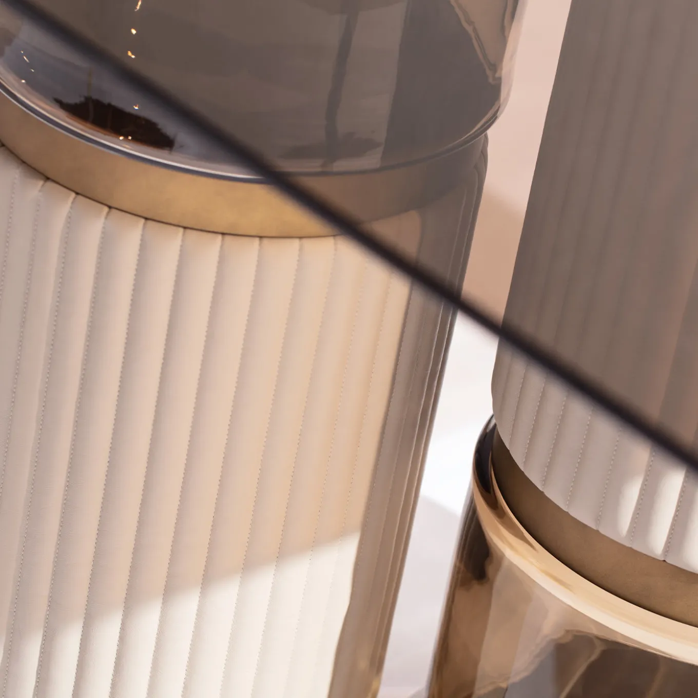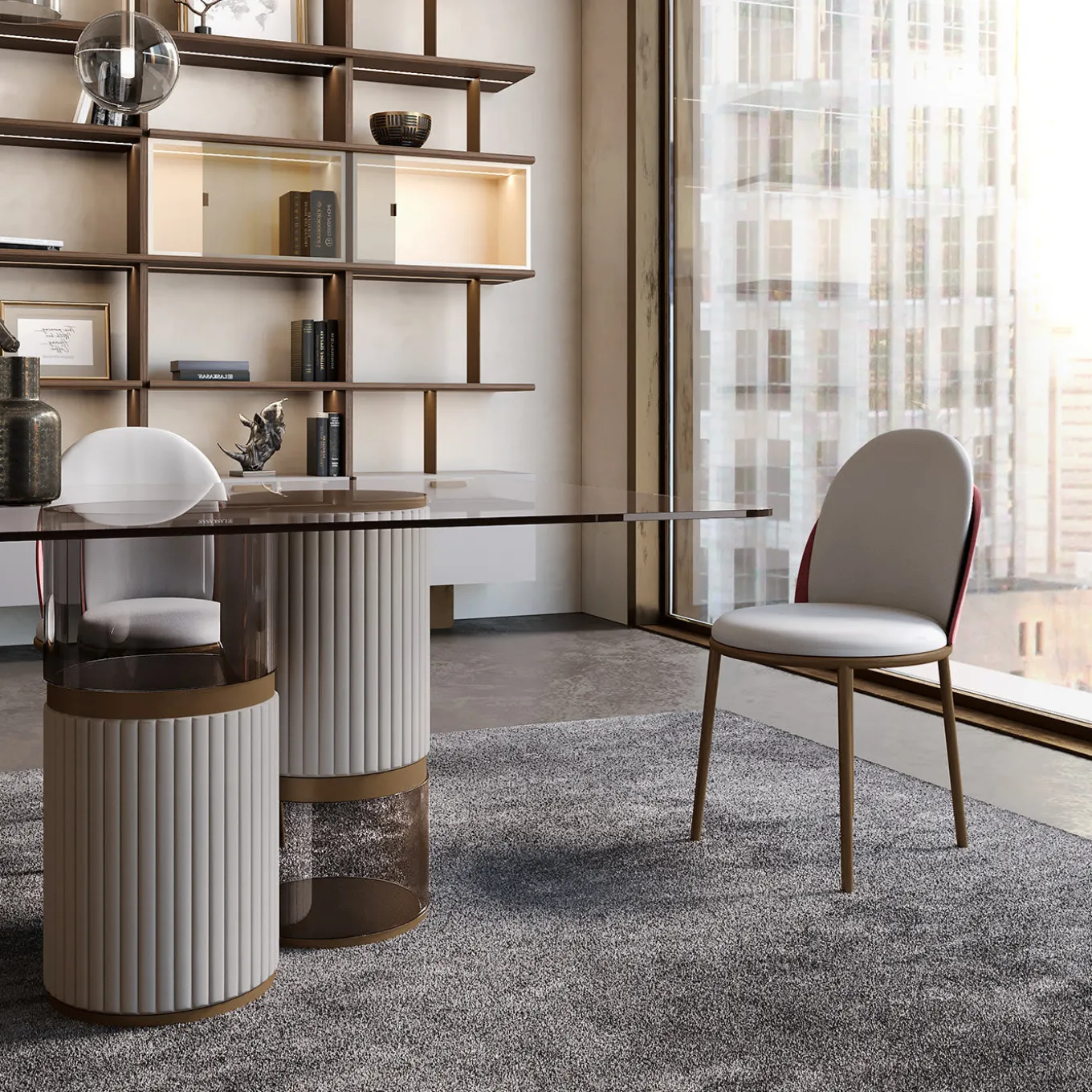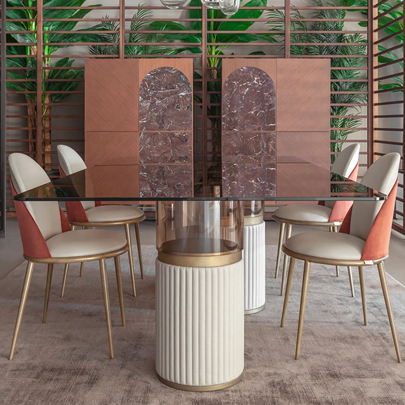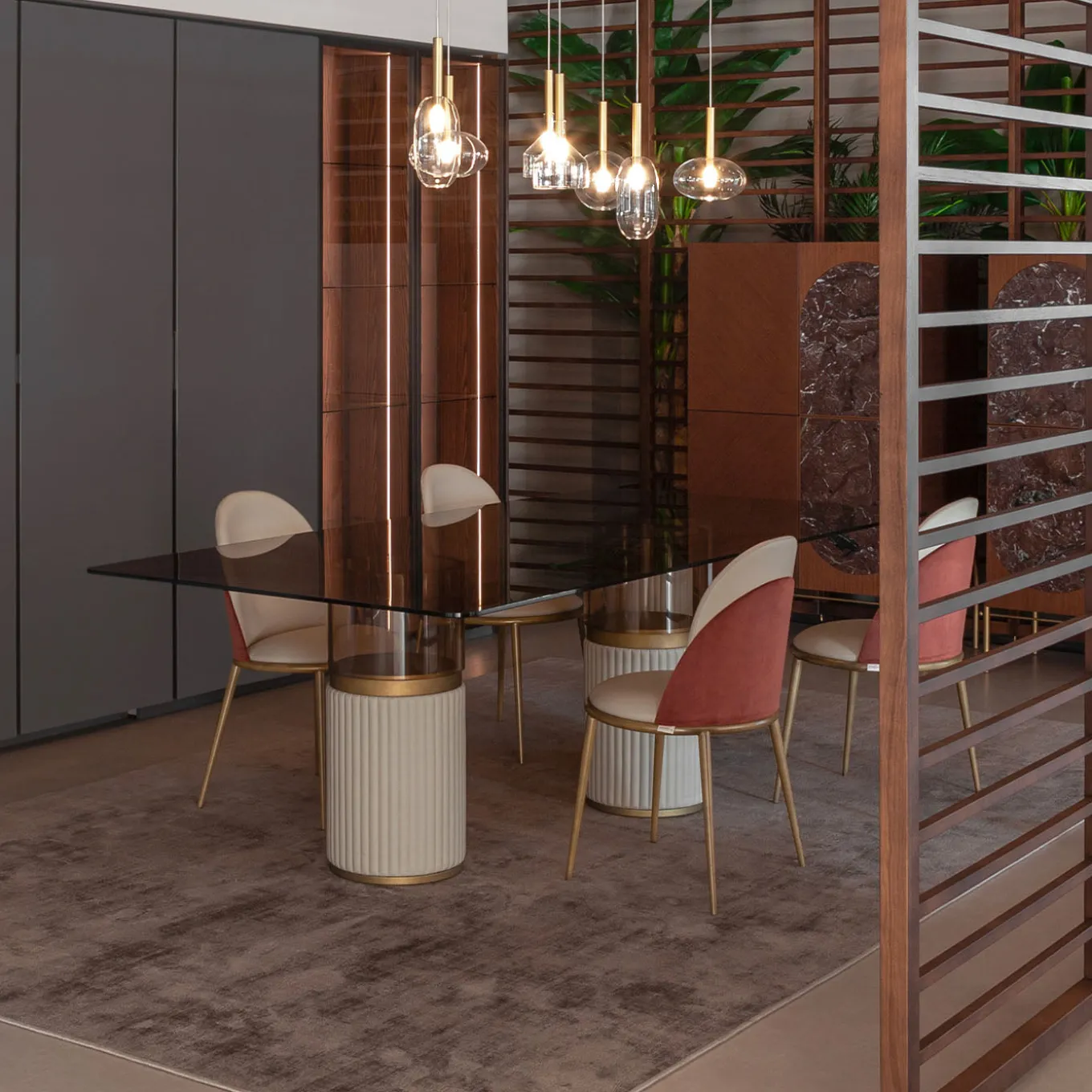Defined by refined sculptural lines, and asymmetrical yet balanced proportions, this gorgeous dining table pairs a rectangular bronzed glass top with a strikingly composed base made of Vitroplex and fine leather. Showcasing a cream tone enhanced with spectacular vertical stitching, leather can be customized in color and type upon request. Please refer to the Concierge for further customization options.