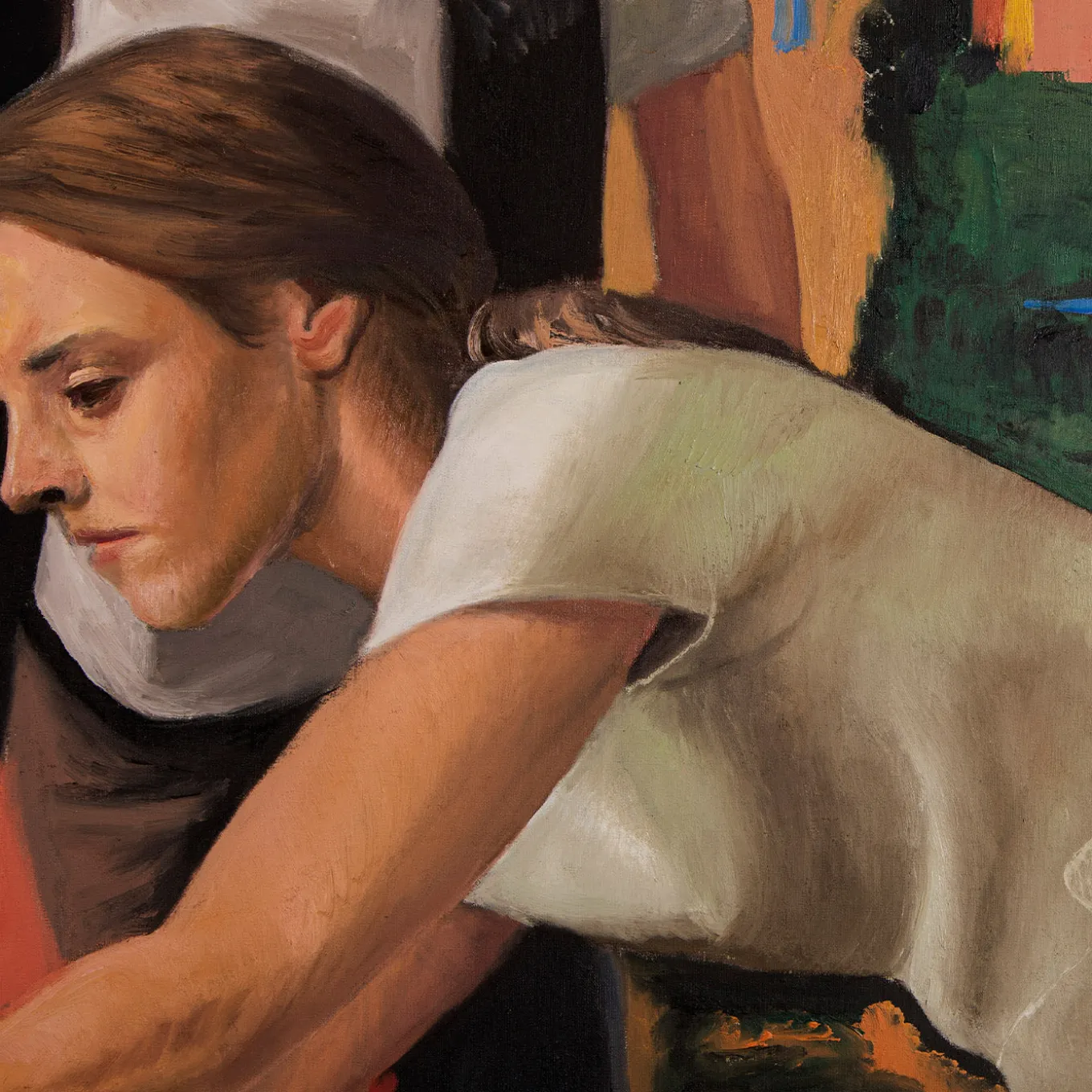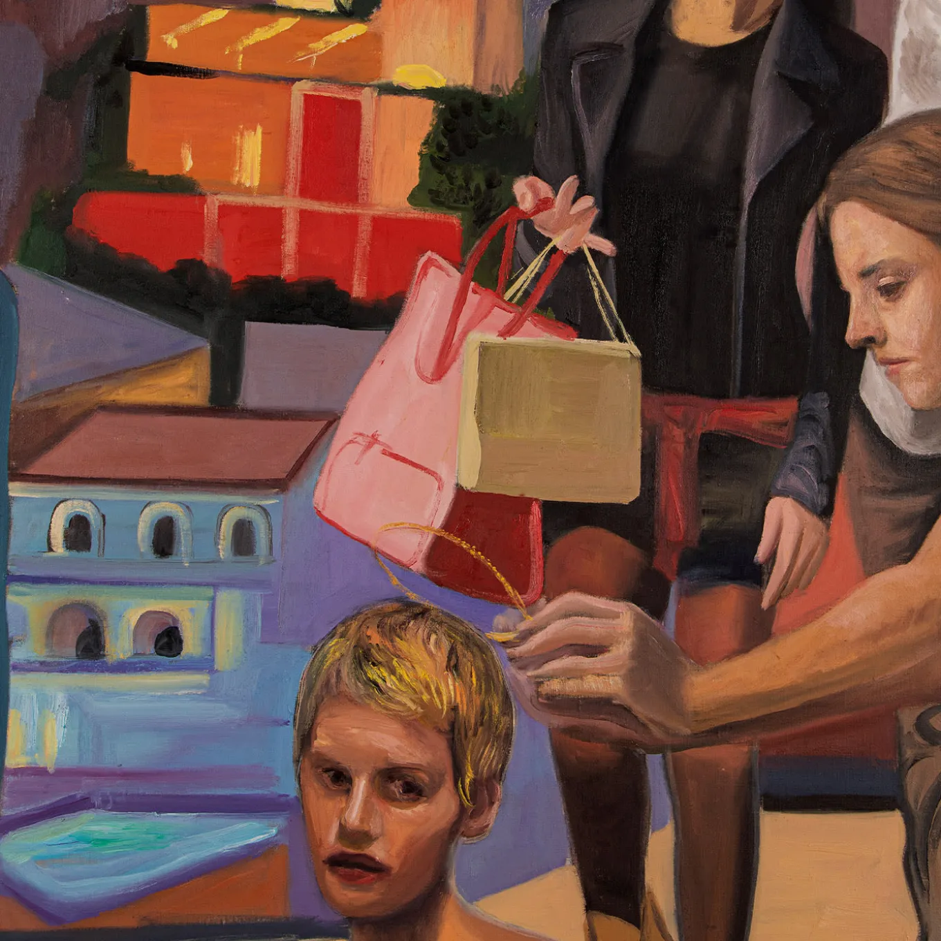 Artist Federico Lombardo gathers assorted female subjects on a beige staircase, the splendor of a coastal city at sunset behind them. The meticulous brushstrokes and daring use of color reveal his inspiration from Giotto. Painted using oil colors on linen, the painting will ideally complement stylish coastal decors. The painting is mounted on wooden frame support.