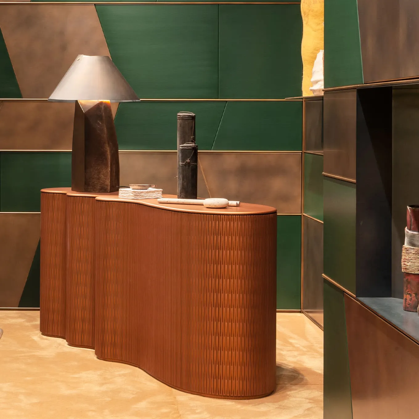 Sleek and sinuous lines of unprecedented character mark the refined aesthetic of the Infinity Console, an iconic accent to a contemporary entryway or living decor. Made of ochre-finished wood enriched with small patterned holes and a smooth top, it is entirely customizable in color. Please consult the Concierge for further details.
