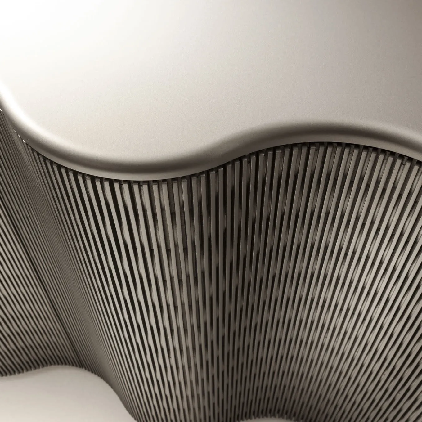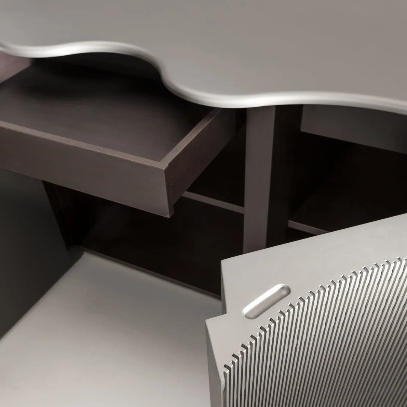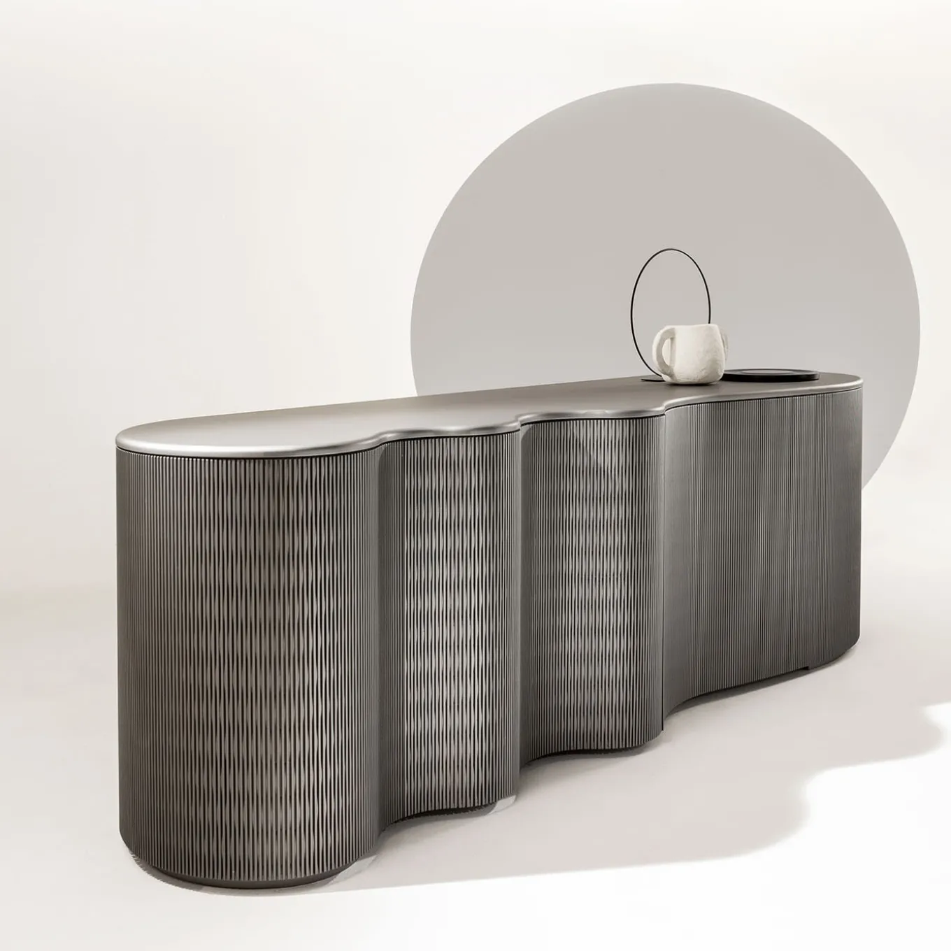 A wavy silhouette recalling a rippled ocean surface immediately states the sculptural charm of this sideboard in Lacca 61 tin lacquered wood. Innerly equipped with two shelves and drawers, it features two textured hinged doors with a push-pull mechanism that does not interrupt its fluid aesthetic. Sealed by a smooth top, the piece can be customized in a variety of lacquer colors and finishing options upon request to the Concierge.