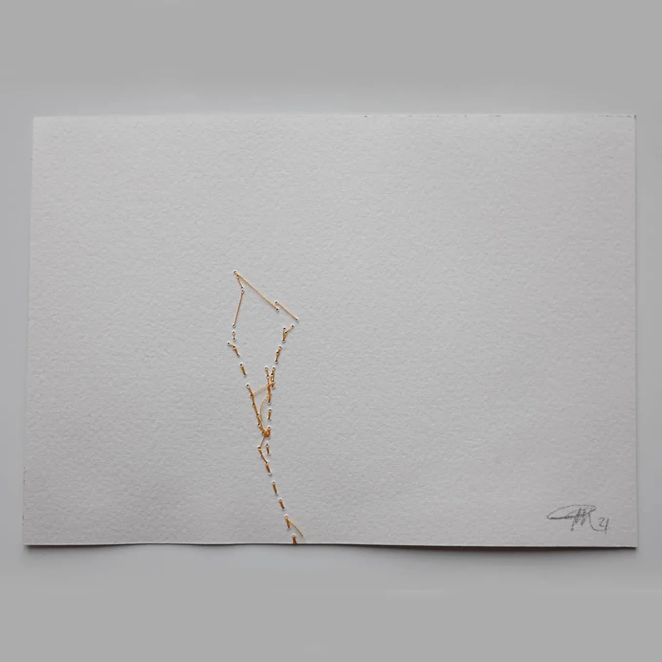 A vaguely naturalistic subject enlivened by gold thread embroidery distinguishes this singular painting. Crafted on a precious sheet of Arches paper (300 g/mq), it strikes with its one-off mottled look obtained by blending black ink with water. Darkness and light, randomness and choice exude from this painting. The frame is not included with purchase.