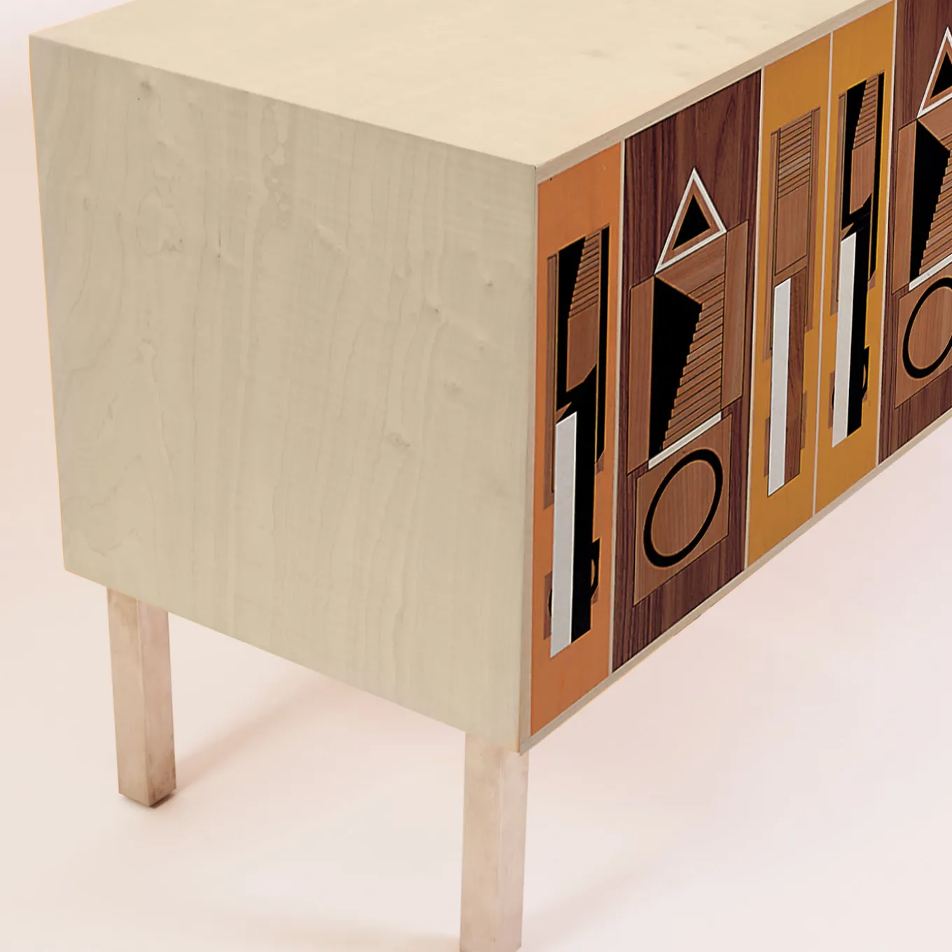 Retro motifs and soft grainy hues abound in this wood sideboard designed by Aldo Rossi and handcrafted by the skilled carpenters of Laura Meroni, using poplar and maple wood veneer. The doors open to reveal adjustable shelves, and an adjustable base worked from brushed stainless steel. Limited Edition.