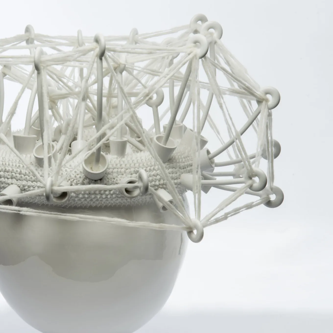 This piece is incredibly unique and will set your interior apart from any other ordinary décor. It is executed in ceramic with a pure white glaze and it is comprised from three main components. Its spherical body sits on a small round base, and is topped by a round component with a prickly surface. From this top piece, stem several arms in silicone holding threads of white wool, which intricately weave around the top of the piece. The contrasting textures of the materials add a nice touch to this decorative object.