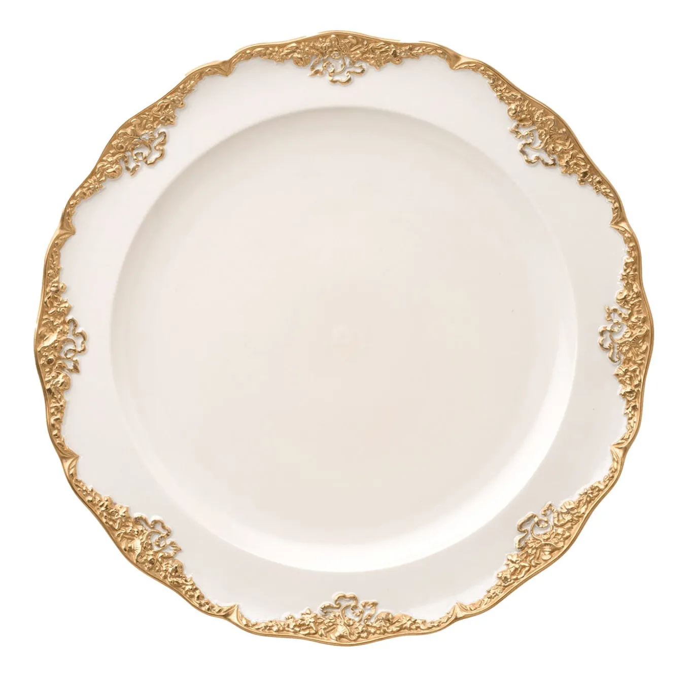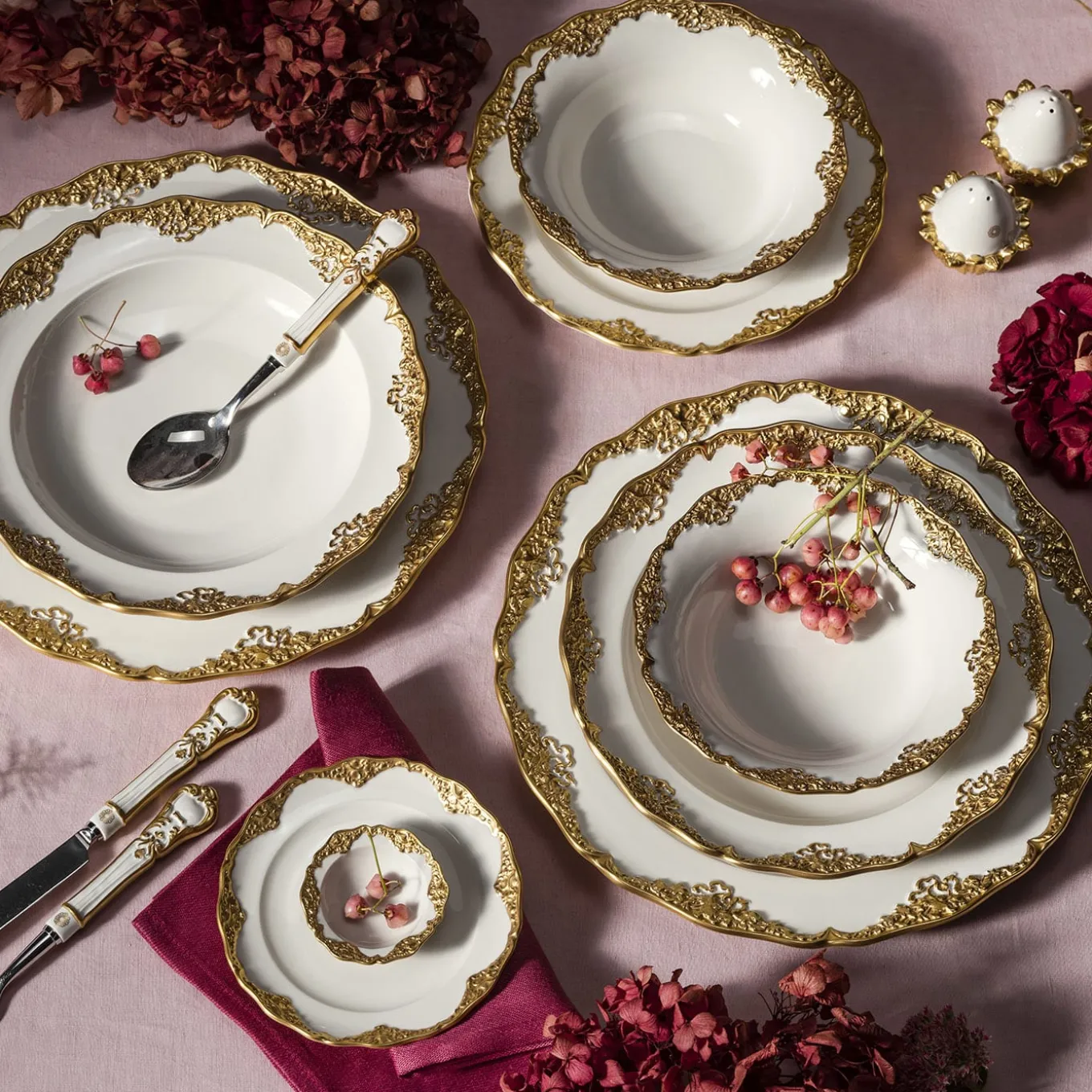This superb porcelain serving plate is sure to infuse classic tables with disarming grace and opulence. The whiteness of the glossy and perfectly smooth porcelain is only interrupted by the intricate raised motifs adorning the borders and luxuriously veiled in pure gold just as the scalloped rim. The whole Irene Collection can be explored in the Artemest catalog.