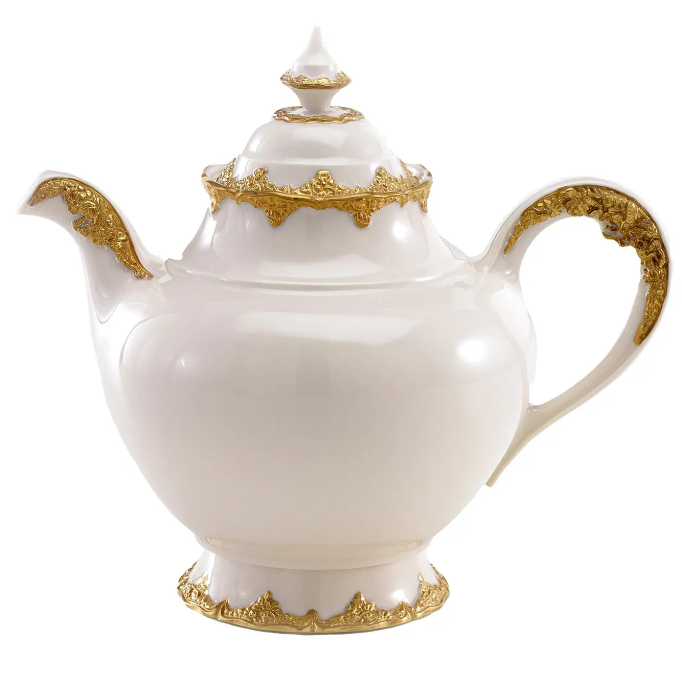 Masterfully handmade decorations in pure gold lend this elegant classic teapot its unmistakable luxurious character. Fashioned of the finest white porcelain, the piece is marked by generous and harmonious curves also extending to the bulging lid, decorated with a delicately tapered finial. More designs from the same series are available in the Artemest catalog for coordinated sets.