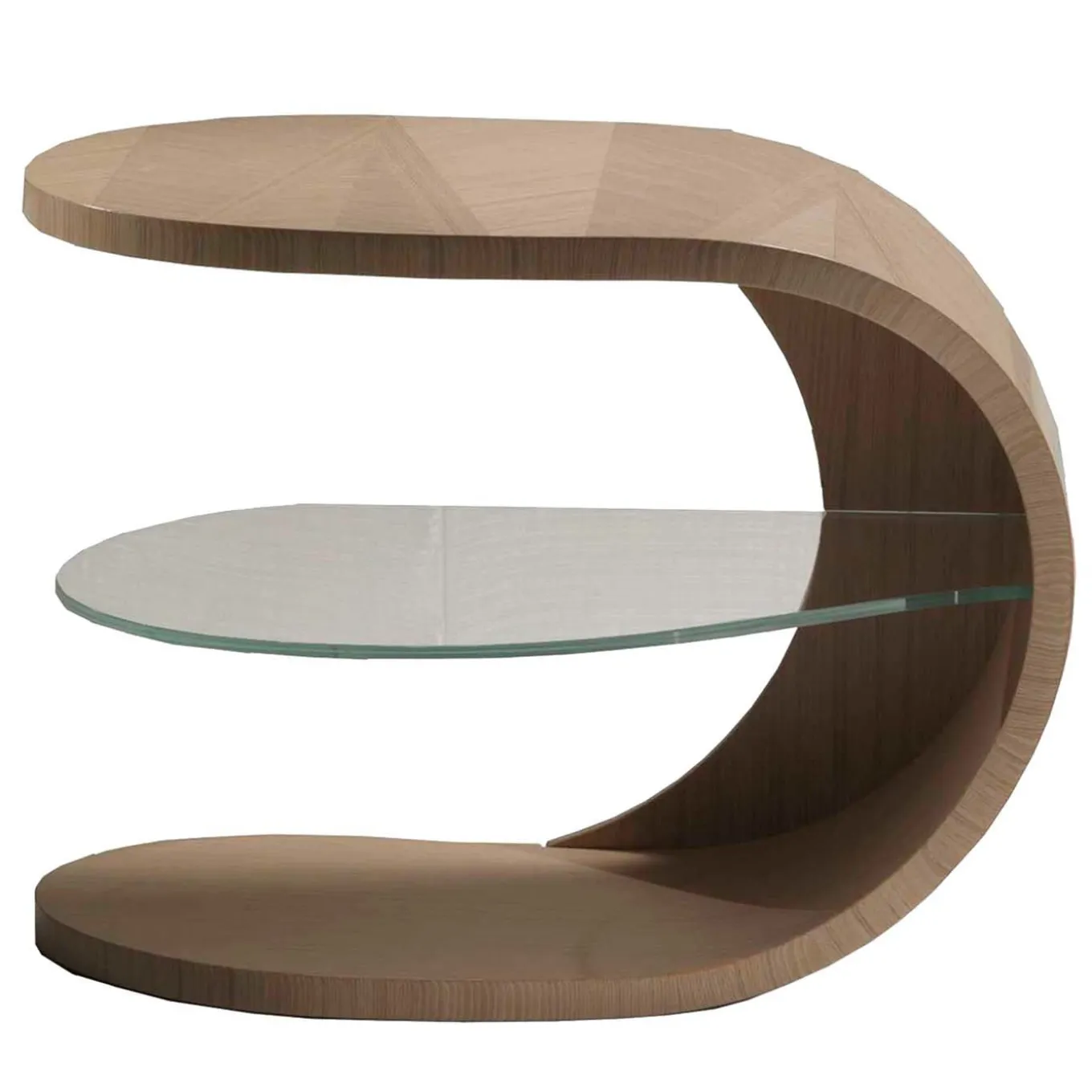 Featuring an innovative curved silhouette, the Iride Bedside Table brings high design into the bedroom. Crafted in oak, the table is completed by a single glass shelf, allowing easy access to your books and other accessories. Pair the table with an equally minimalist lamp for an easy, calming look.