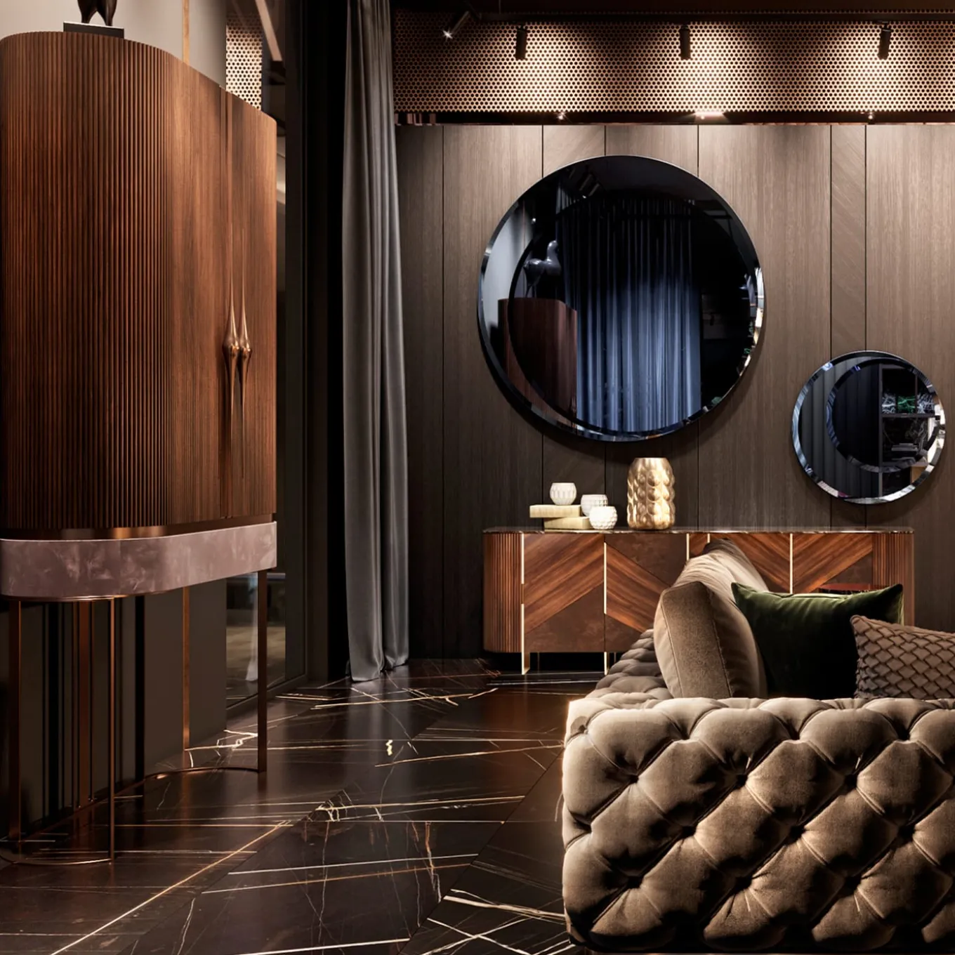 A sideboard of great character, which re-proposes the cabinetmaking tradition of Medea. The alternation among the wood inlays, the leather and metal inserts in the new copper finish, create a movement of interrupted lines that continues in the base. The top is in marble.