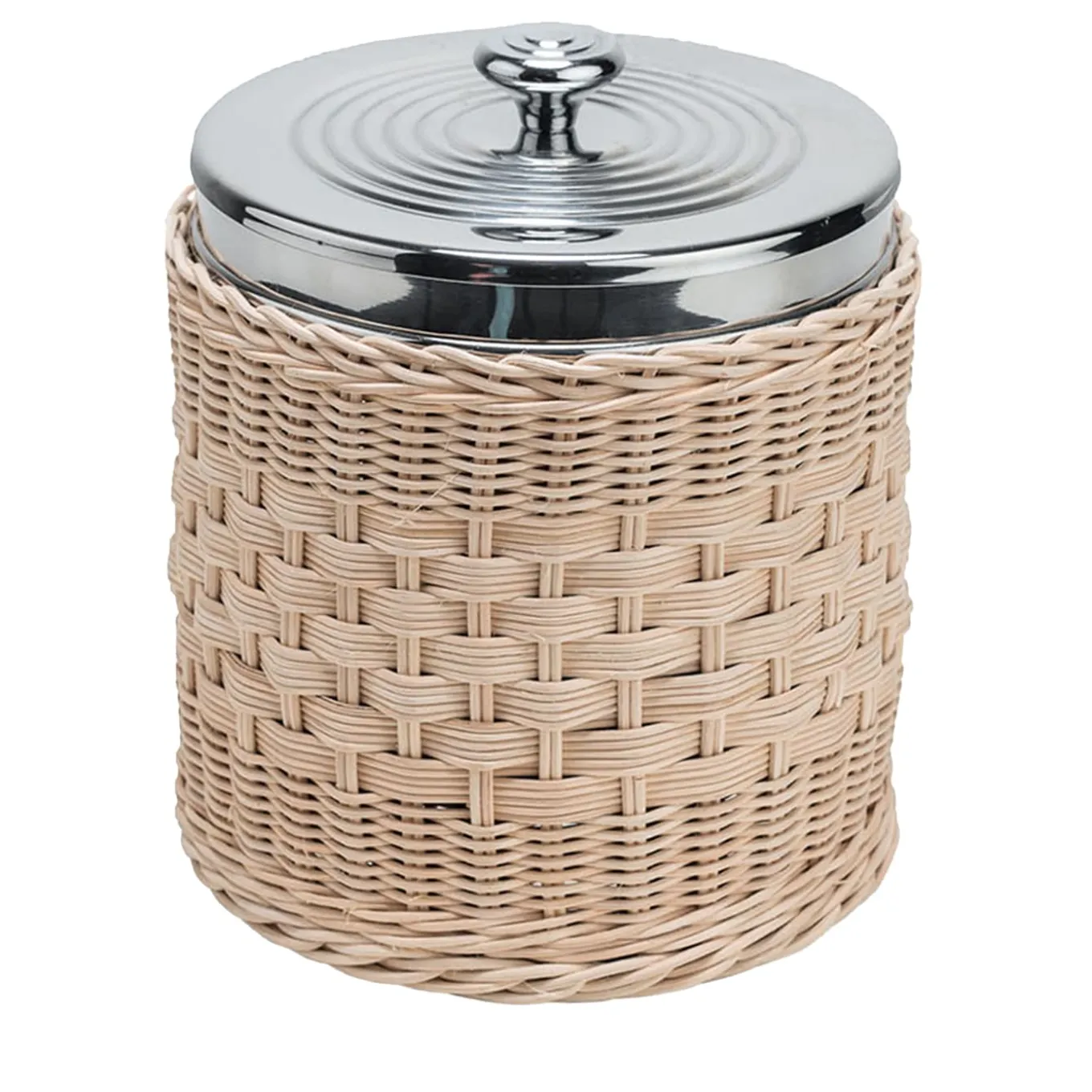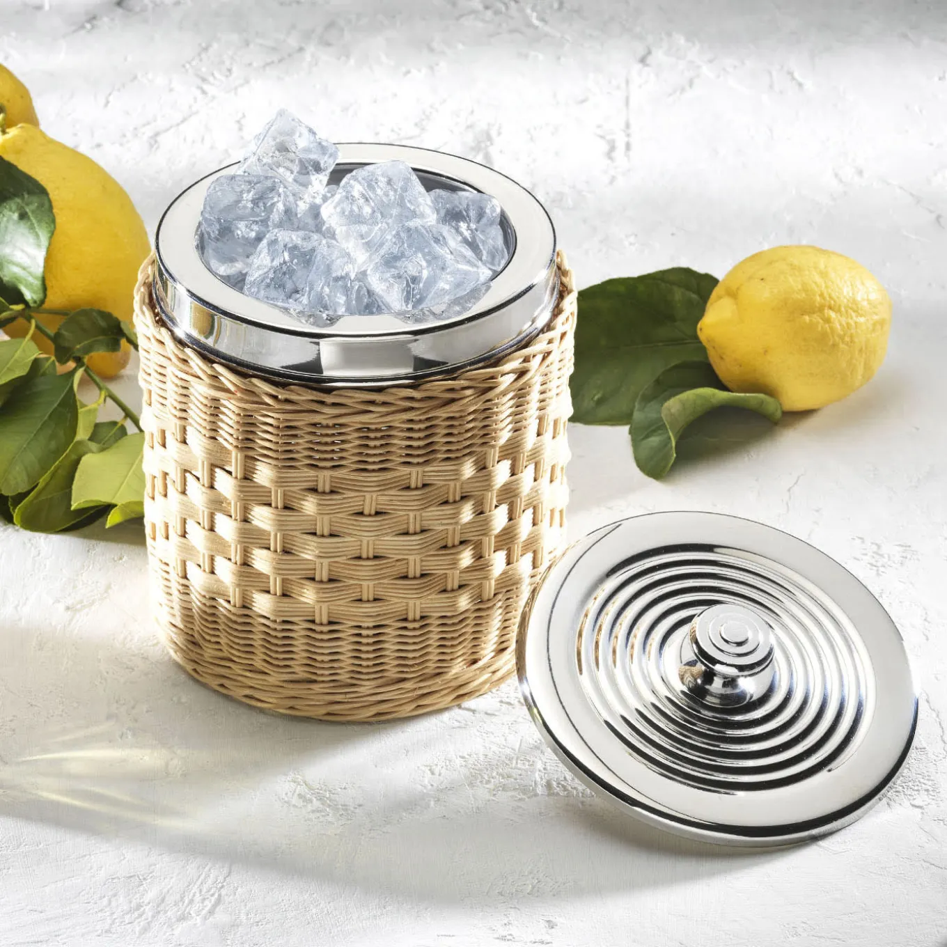 Weaving tradition and modern cooling technology merge in this iconic ice bucket fashioned of steel, refined addition to a bar corner or summer table to be coupled with tongs. It features a double-walled design avoiding condensation and is set in an enthralling wicker basket crafted by the expert hands of master weavers using reeds, their look protected by a water-based finish. A practical lid completes the piece.
