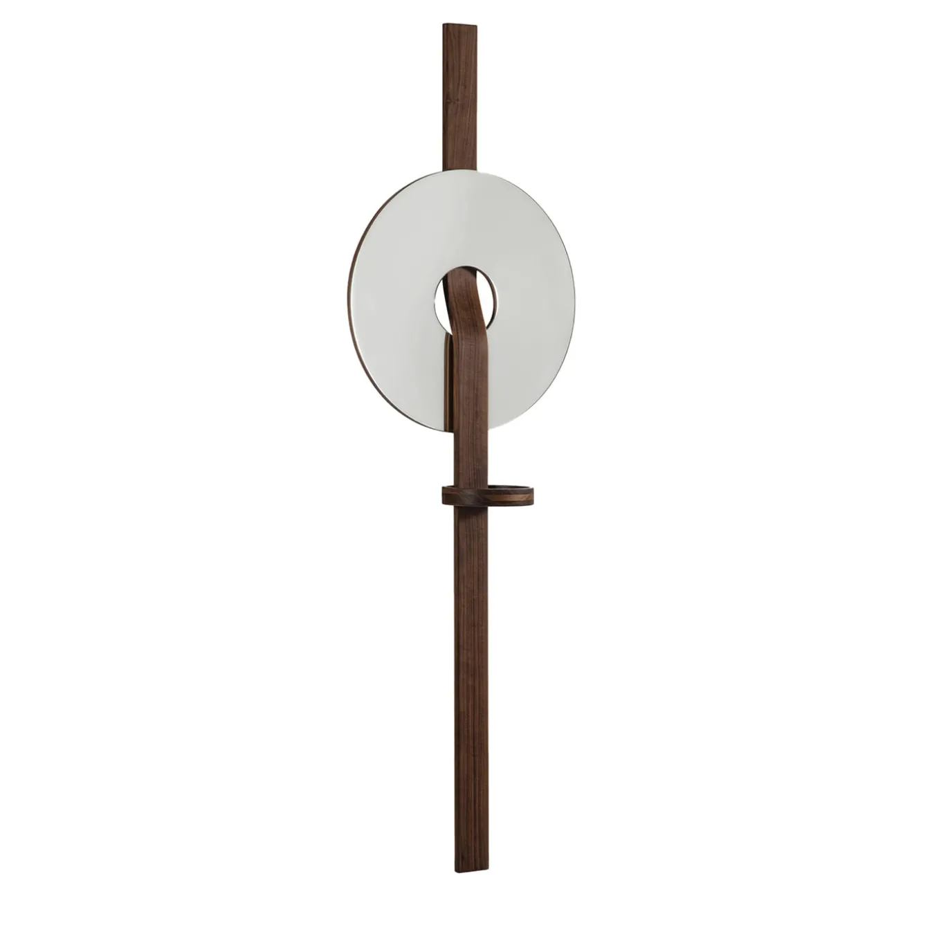 This wall mirror is a triumph of geometric volumes arranged in a sculptural composition of unmistakable contemporary inspiration. The disk-shaped mirrored glass element is pierced by the slightly curved band in solid Canaletto walnut that serves an essential structural function. The tiny, built-in tray completes the design.